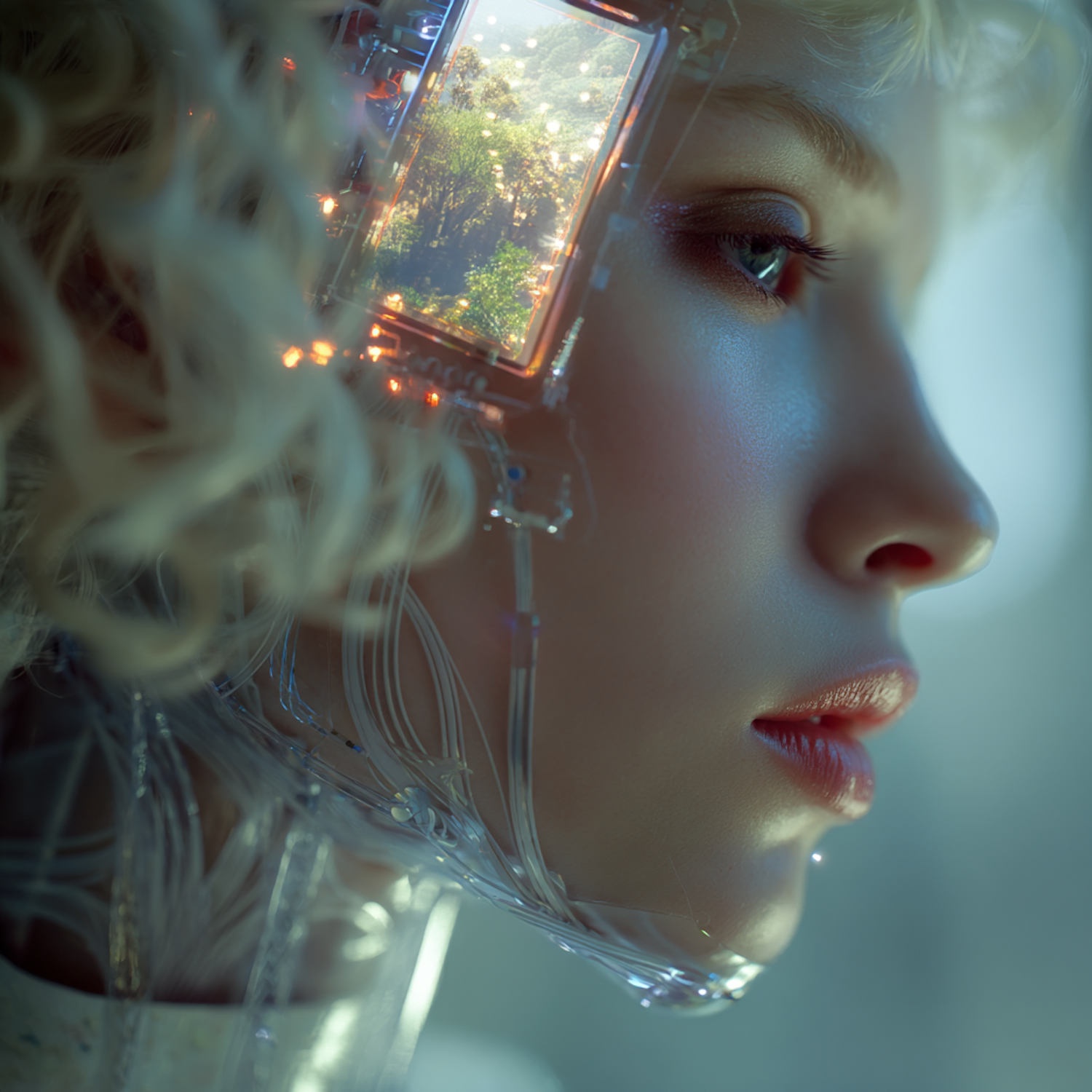 A futuristic portrait showcasing a person with advanced headgear featuring a screen displaying a natural scene, blending tech and nature.