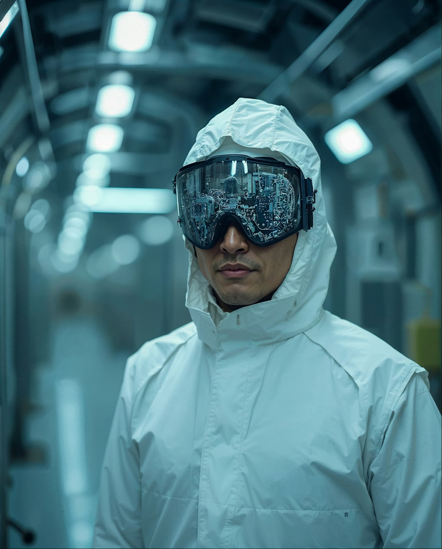 Asian man in a white protective suit with futuristic goggles in a high-tech corridor.