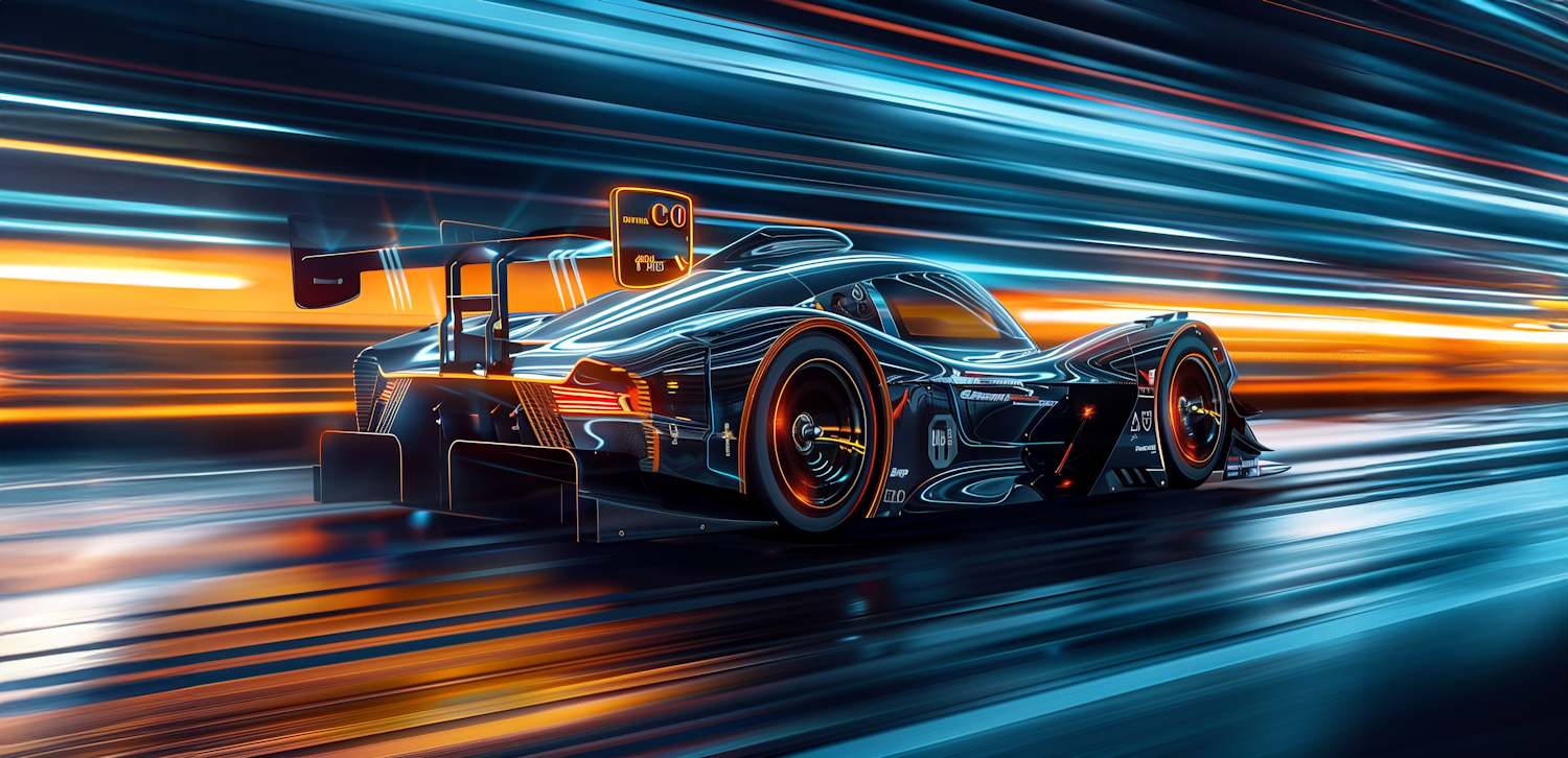Futuristic race car speeding through neon-lit environment with dynamic light trails and sleek design.