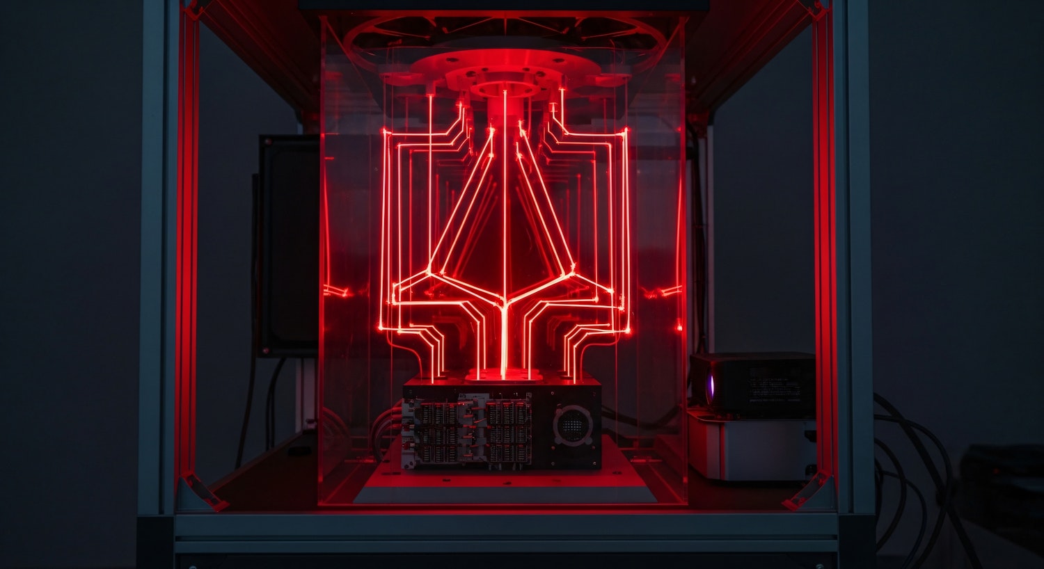 A glowing red geometric light pattern inside a transparent box, surrounded by metallic and electronic components in a dark setting.