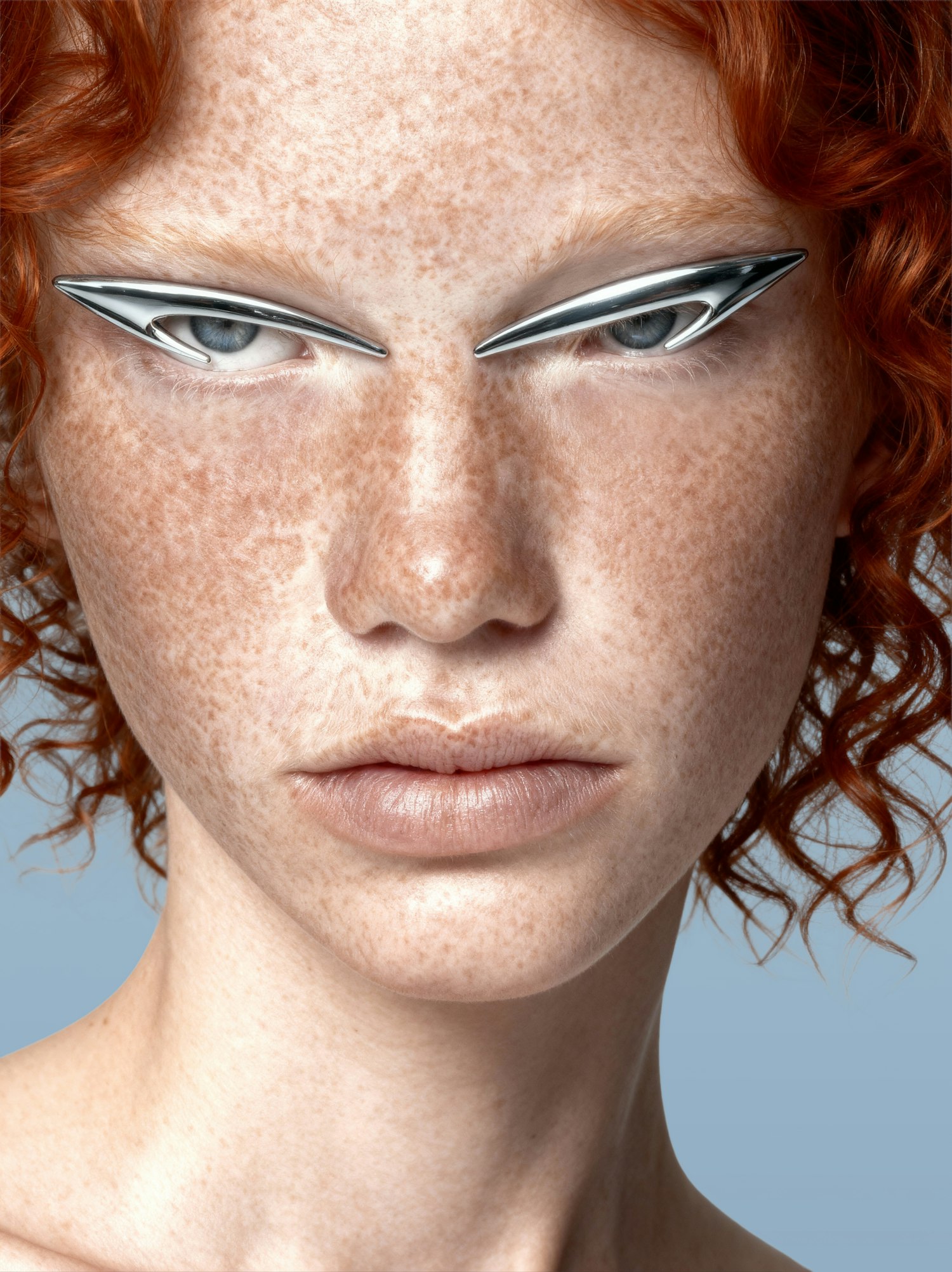 Close-up of a person with red hair and metallic eye makeup, showcasing a bold and futuristic style against a light blue background.