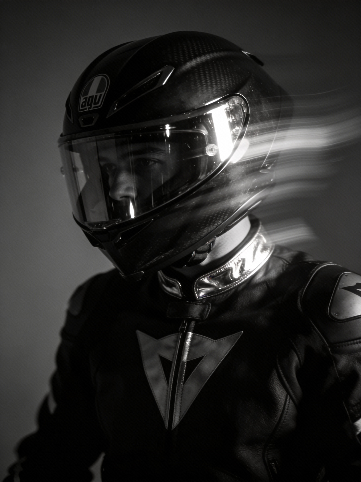 Monochrome image of a motorcyclist in a sleek helmet and leather jacket, with dramatic lighting and a blurred background.