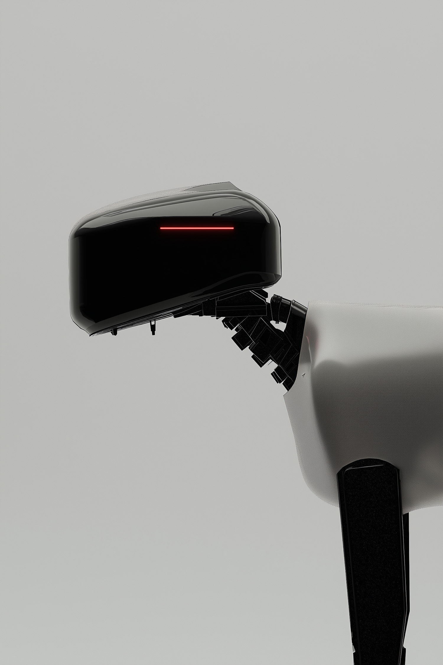 Futuristic robot with a glossy black head, red light eye, and articulated neck. Minimalist design with smooth white casing and clean lines.