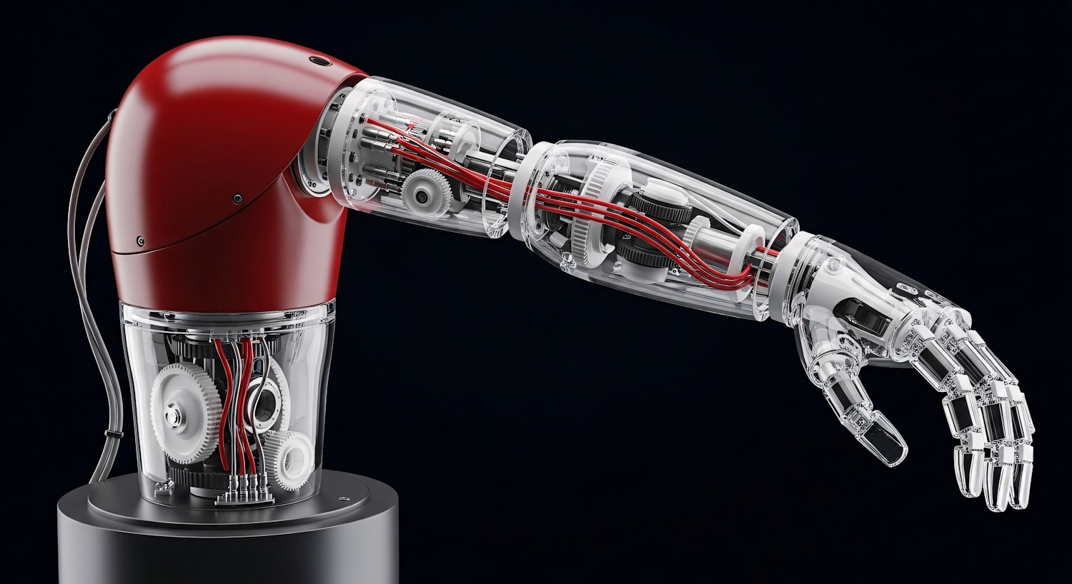 Futuristic robotic arm with transparent design showcasing intricate gears and wiring, set against a sleek dark background.