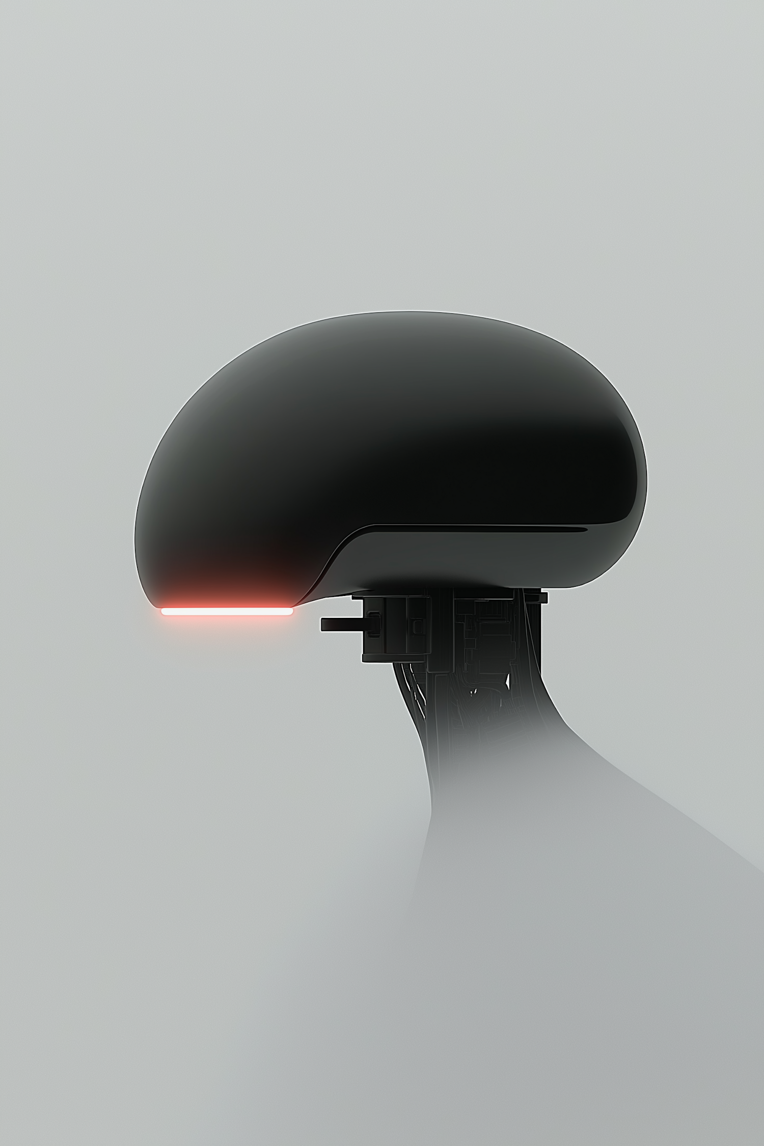 Minimalist robotic head with a black dome, glowing red light, and exposed mechanical parts in a foggy, futuristic setting.