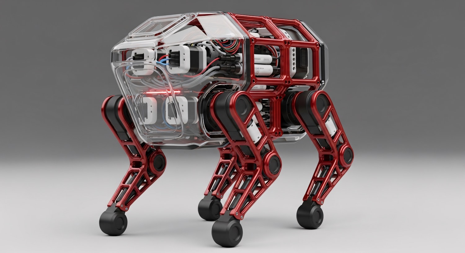 Futuristic robotic quadruped with a transparent body and red metallic frame, showcasing intricate internal components and wiring.