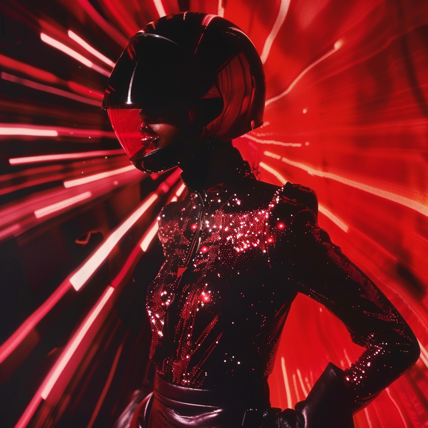 Futuristic figure in a sparkling outfit and helmet, set against a dynamic red light explosion. Sci-fi meets high fashion vibes.