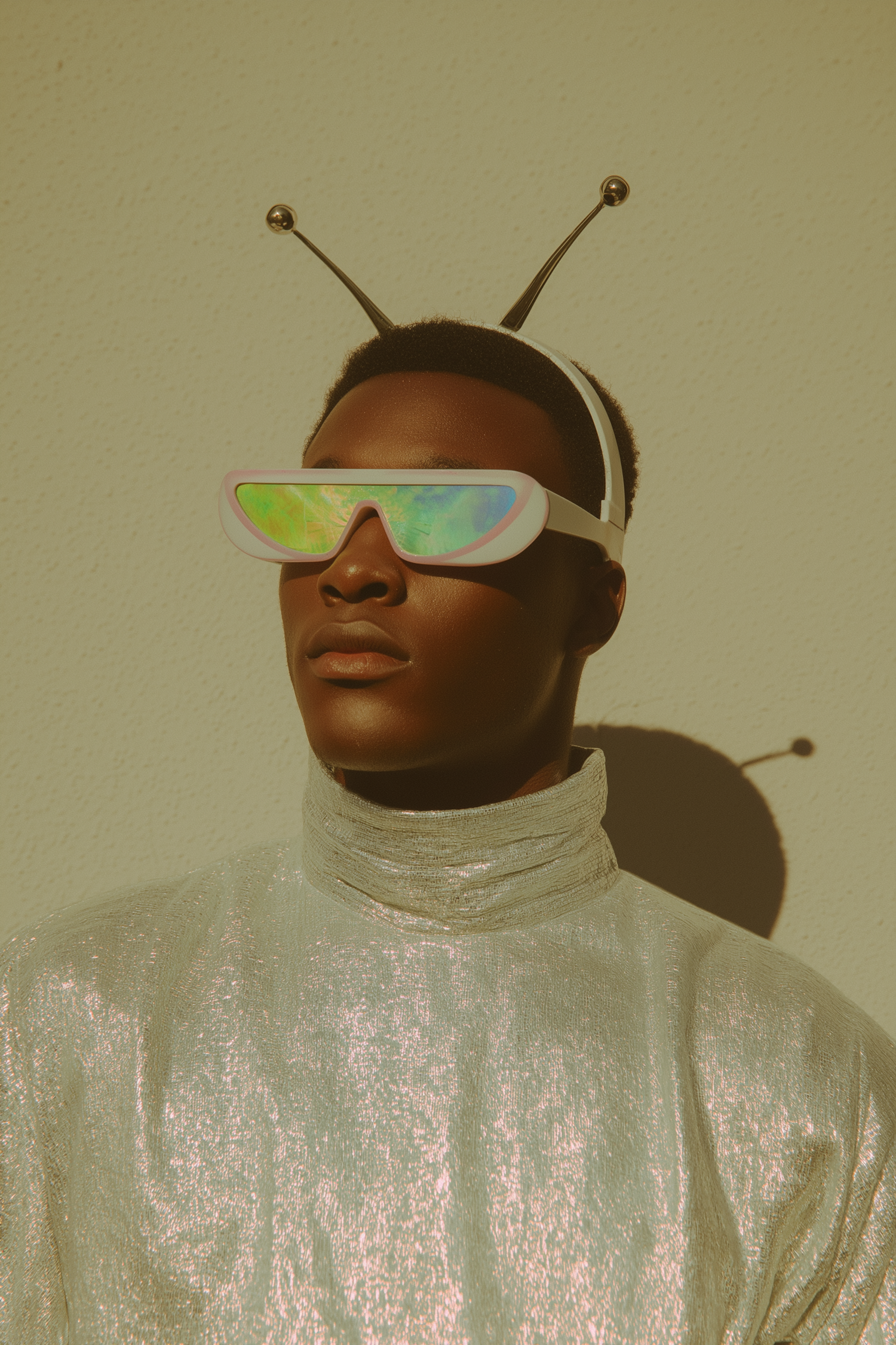 Futuristic portrait of a person in metallic attire, iridescent glasses, and antenna headband, set against a warm, textured background.