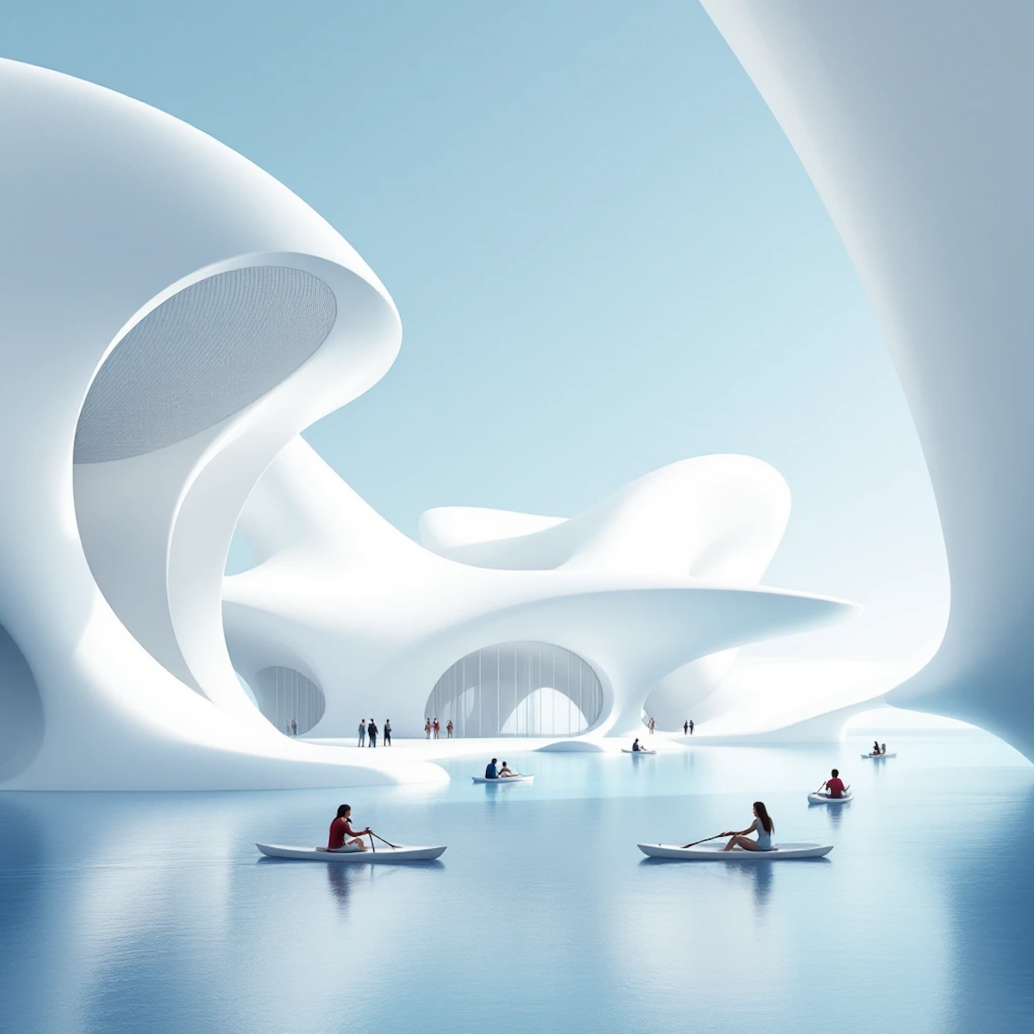 Futuristic white organic architecture over calm water with people rowing boats under a clear blue sky. A serene and surreal scene.