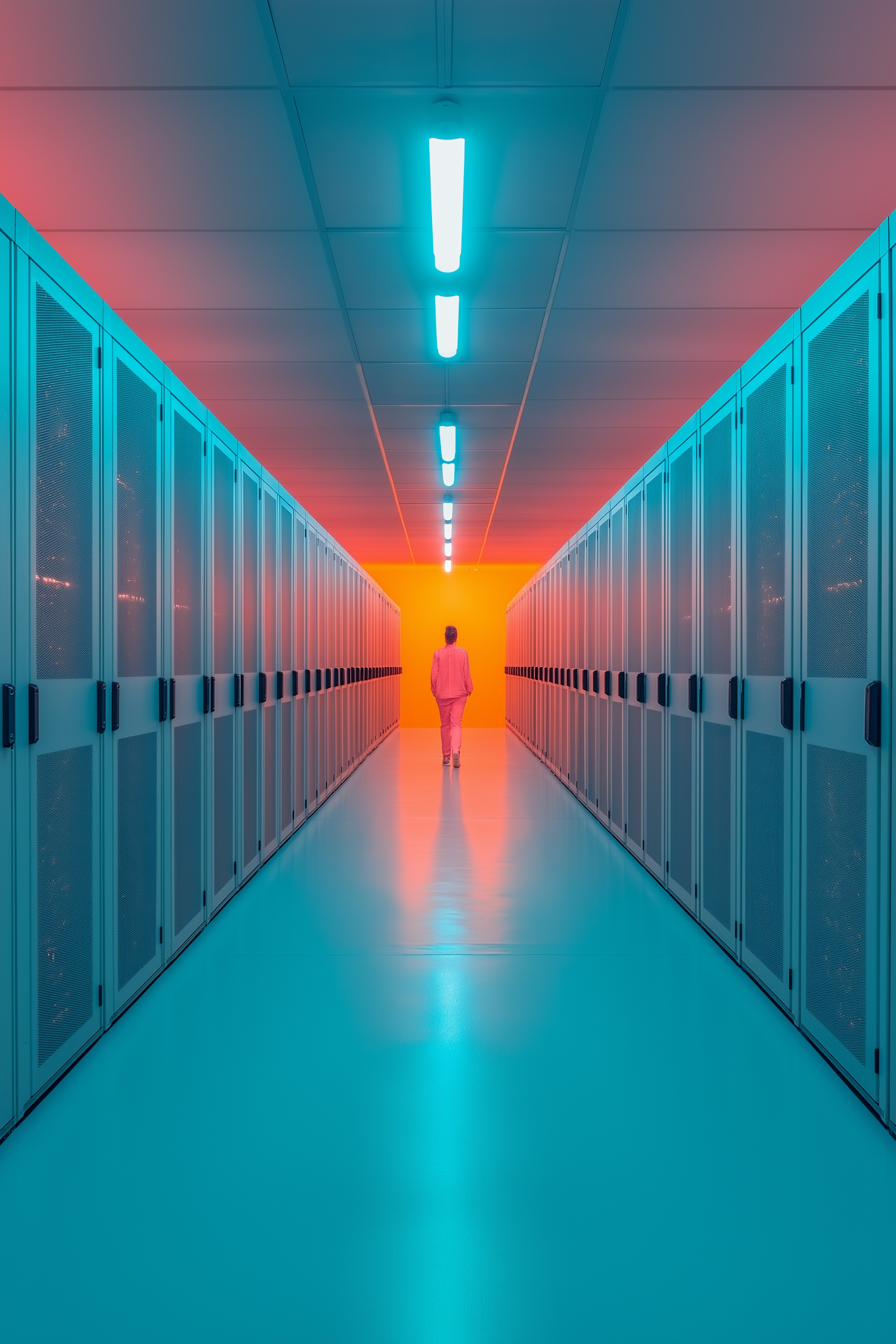 Futuristic corridor with server racks, blue lighting, and a person in a suit walking towards a warm orange light.