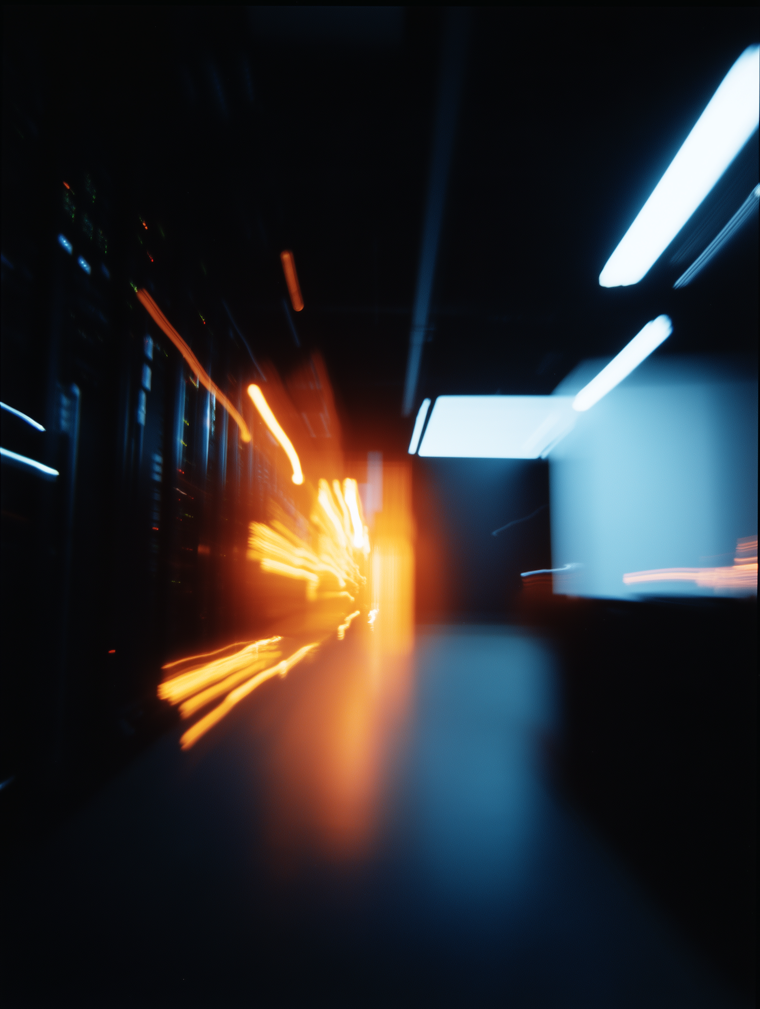 Abstract image of a server room with streaks of orange and blue light, creating a futuristic and high-tech atmosphere.