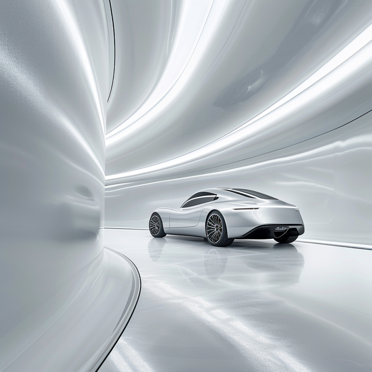 Futuristic silver sports car in a sleek, modern tunnel with reflective surfaces and flowing lines, exuding speed and luxury.