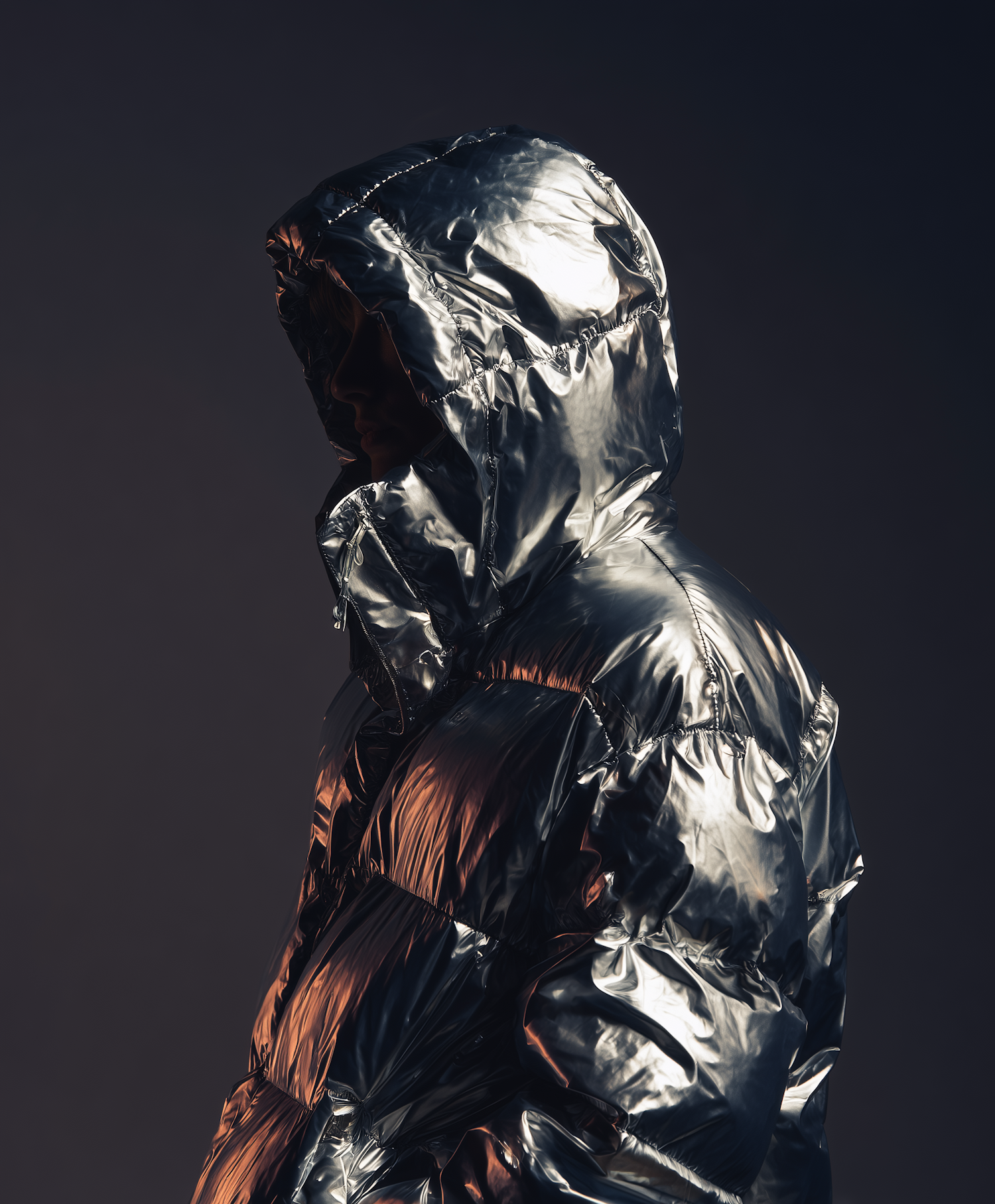 A person in a reflective silver puffer jacket stands against a dark background, highlighting the jacket's glossy, futuristic texture.