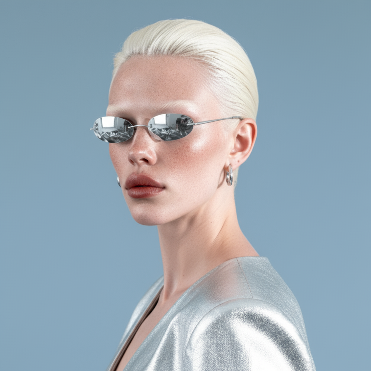 A stylish individual with platinum blonde hair, reflective sunglasses, and a silver outfit against a light blue background.