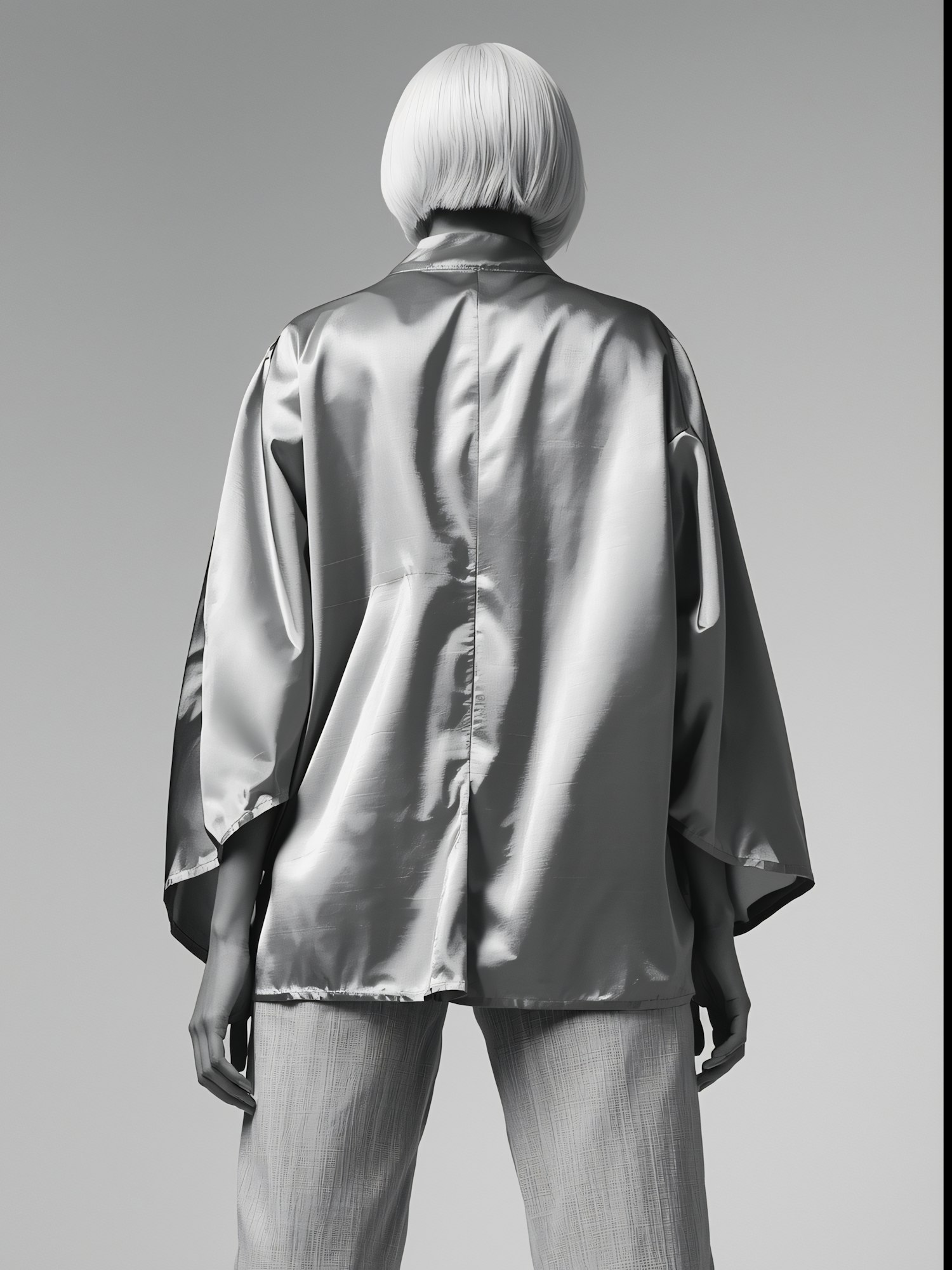 A stylish individual in a metallic silver jacket and light pants, viewed from the back, showcasing a modern and sleek aesthetic.