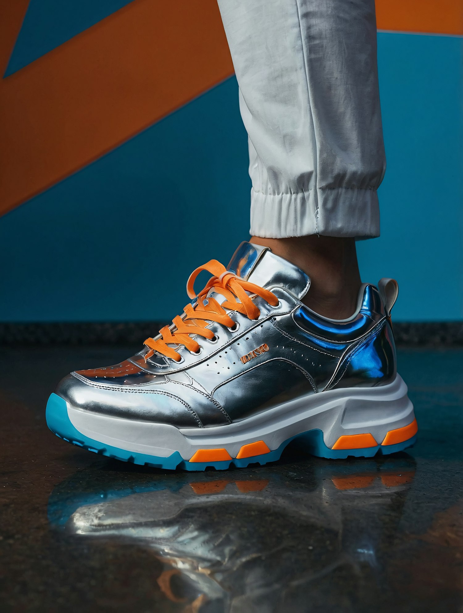 Futuristic metallic silver sneakers with orange laces and a chunky sole, paired with white joggers against a bold blue and orange backdrop.