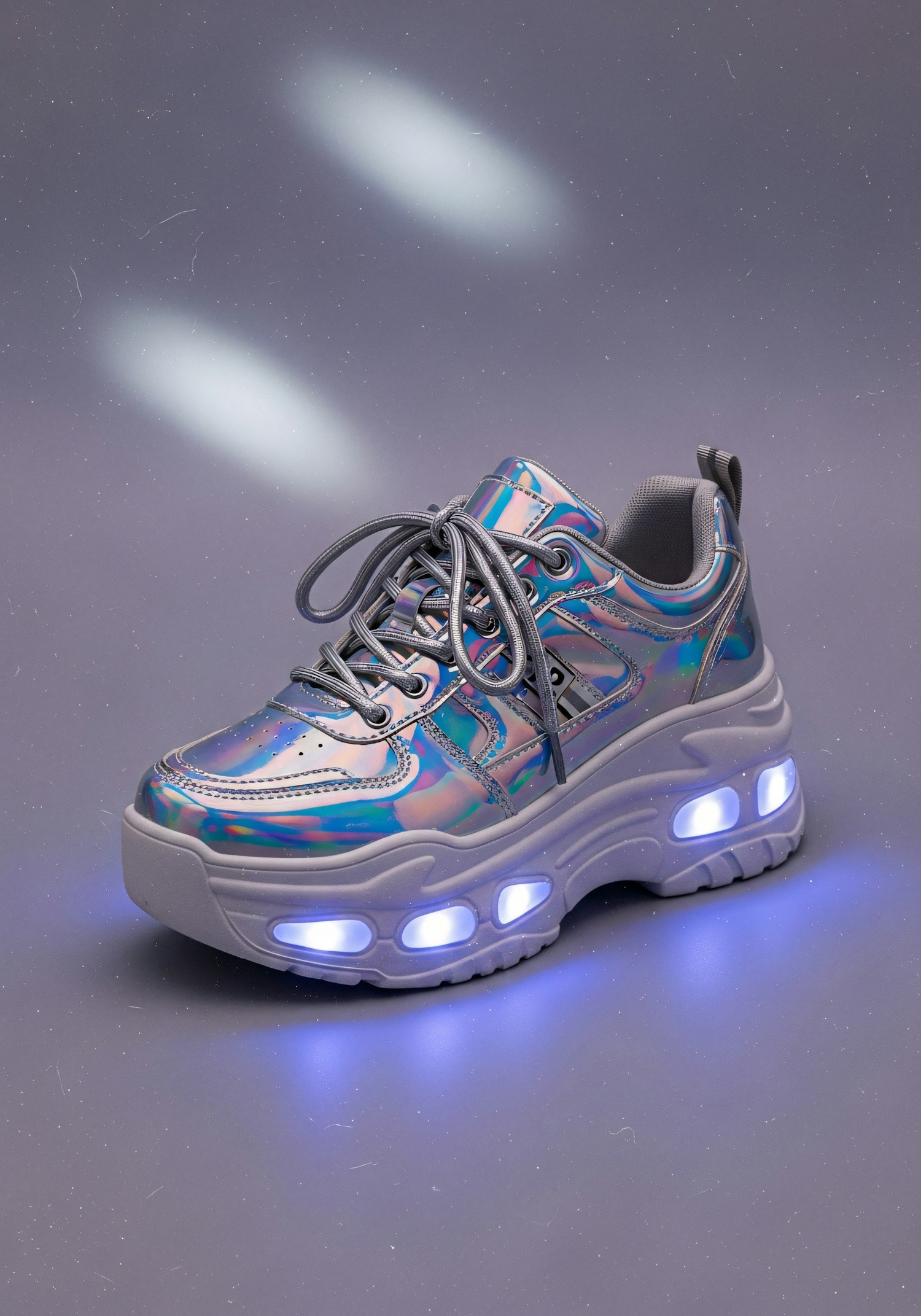 A stylish sneaker with an iridescent finish and glowing LED sole, set against a sleek gray background with subtle lighting.