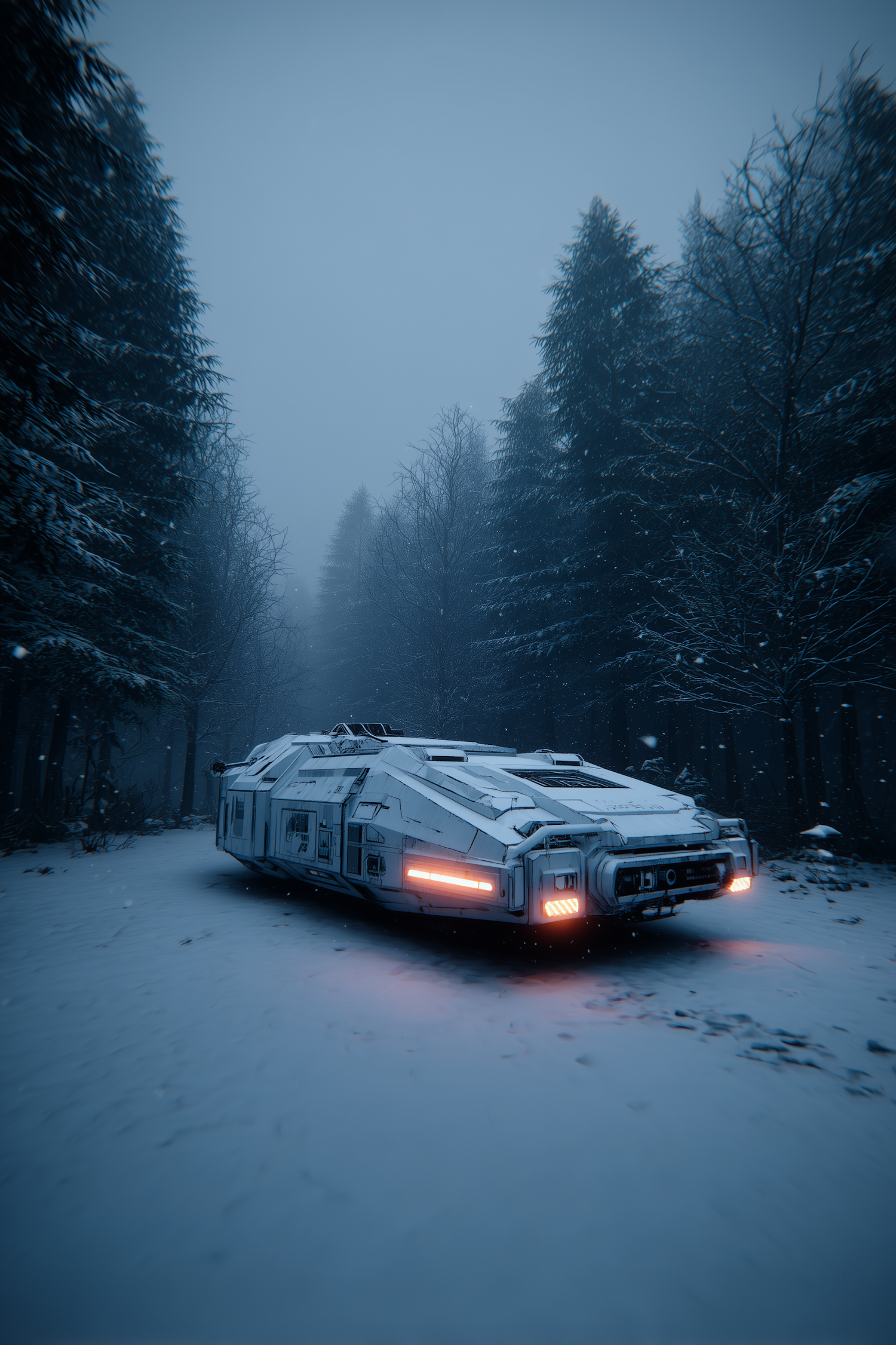 A futuristic vehicle with glowing lights rests on a snowy forest path, surrounded by tall trees and a foggy, serene atmosphere.