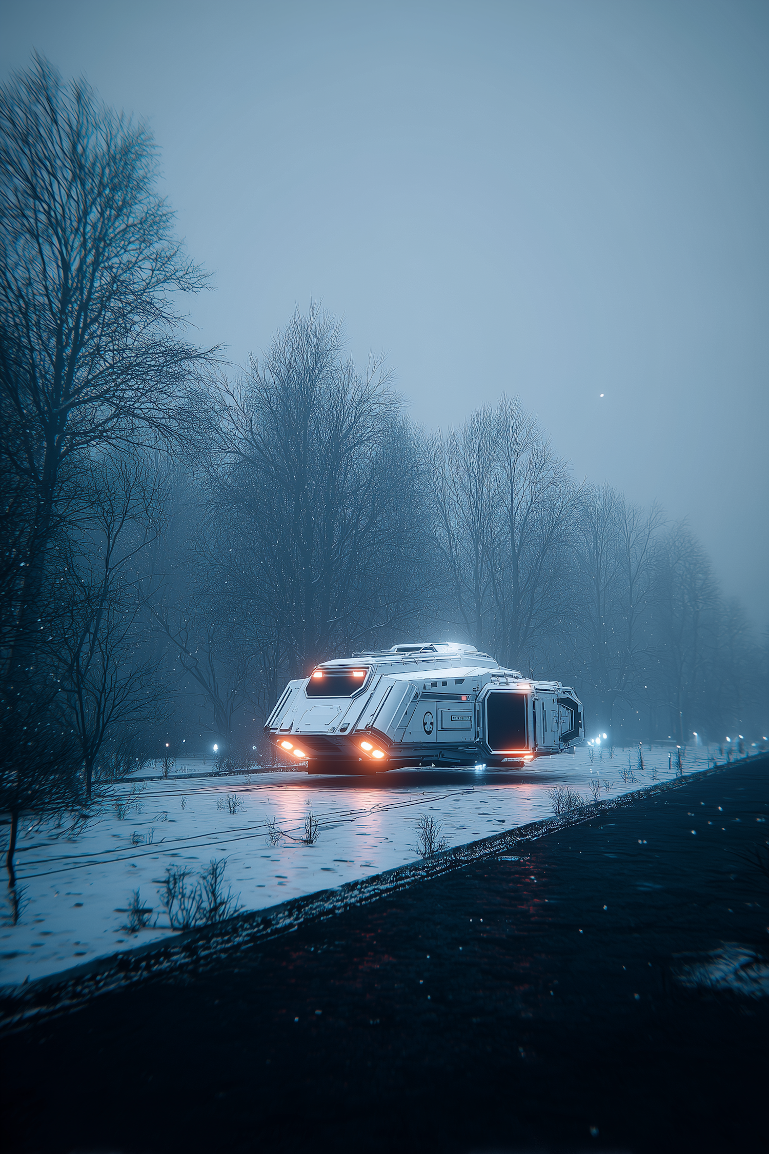 A futuristic vehicle glows softly in a snowy, misty forest, surrounded by bare trees and a serene, mysterious atmosphere.