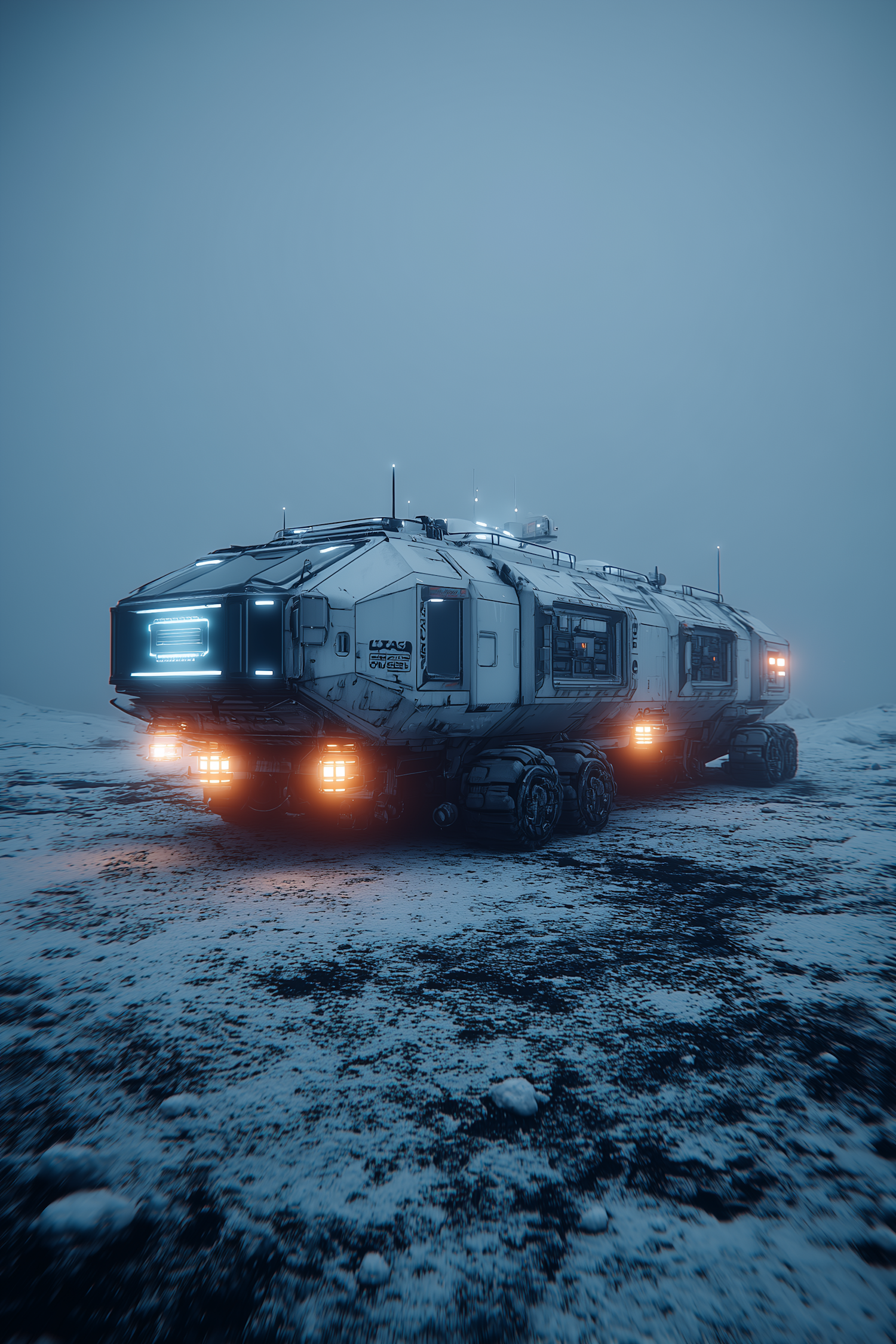 A futuristic vehicle with bright lights parked on a snowy terrain under a foggy sky, showcasing advanced design and rugged functionality.