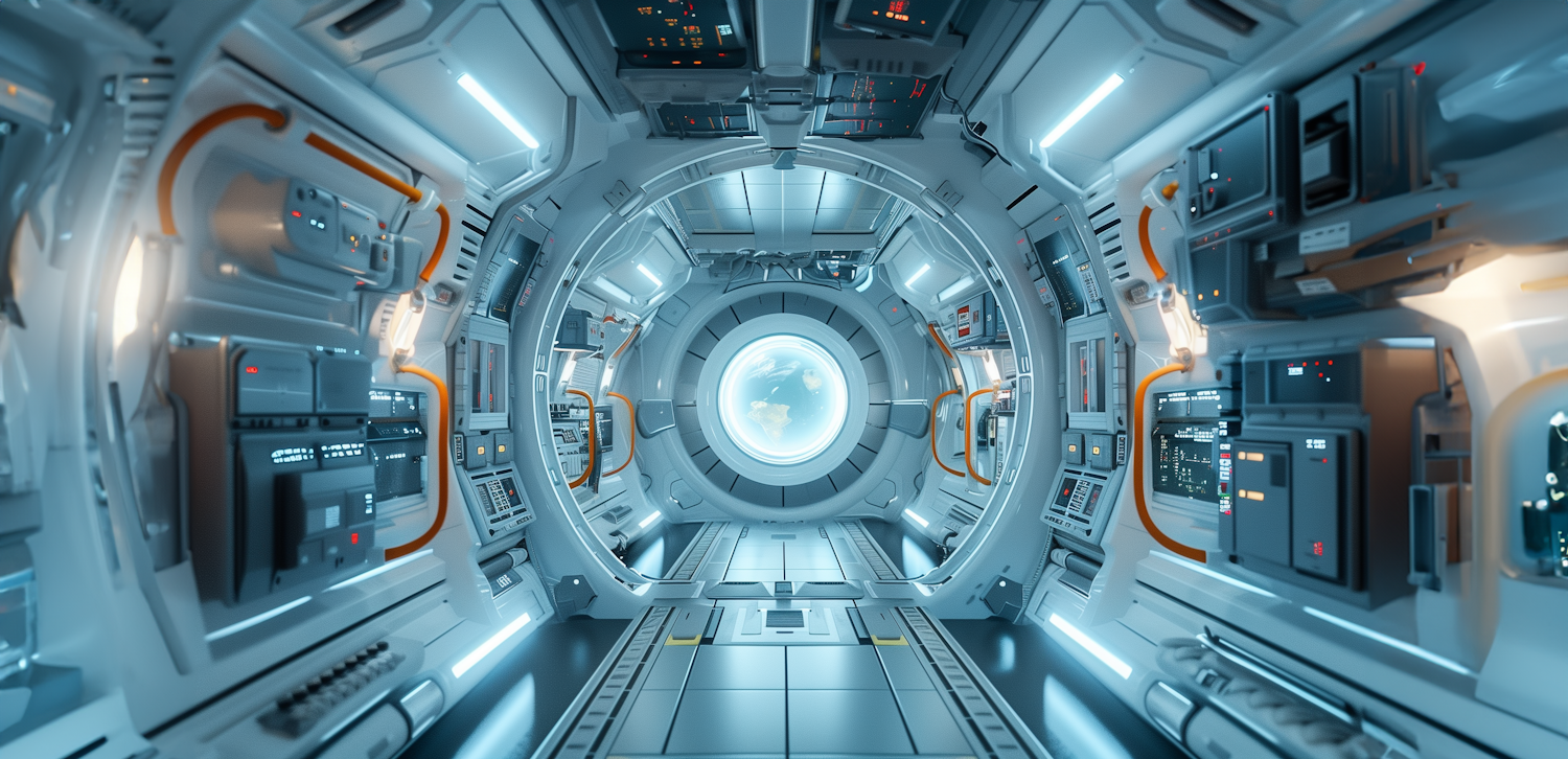 Futuristic spacecraft interior with control panels, glowing lights, and a view of Earth through a circular window.