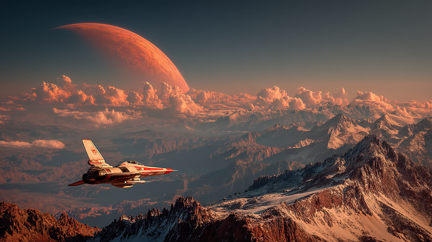 A sleek spacecraft soars over snowy mountains under a red planet's glow, blending sci-fi adventure with breathtaking natural beauty.
