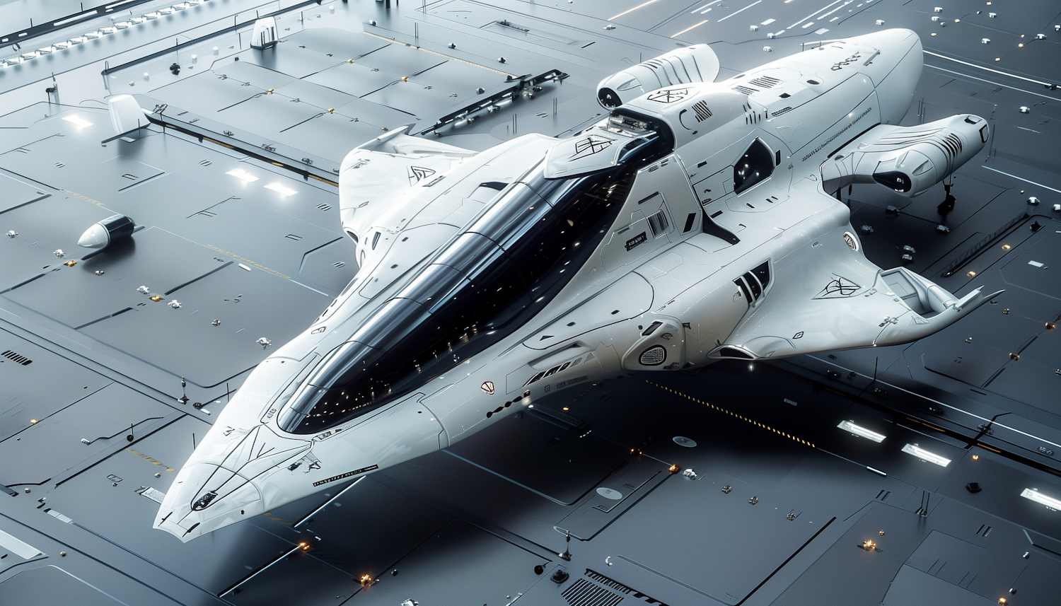 Futuristic white spacecraft on a metallic platform, featuring sleek design and advanced technology, ready for space exploration.