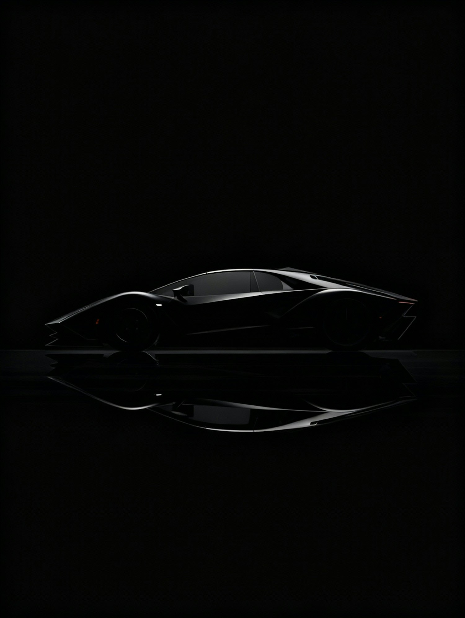A sleek, futuristic sports car with sharp lines and a reflective surface, set against a dramatic black background.