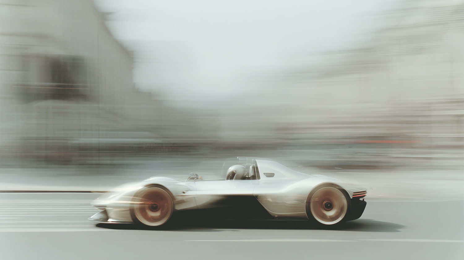 A futuristic silver sports car speeding through a city street, with motion blur emphasizing its sleek design and high velocity.