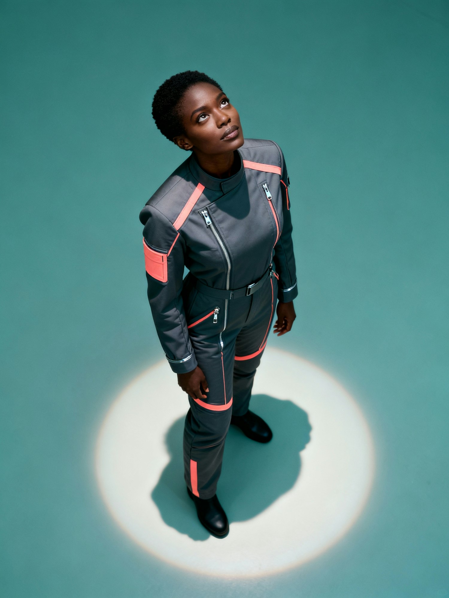 A person in a futuristic gray jumpsuit with pink accents stands in a spotlight, gazing upward against a teal background.