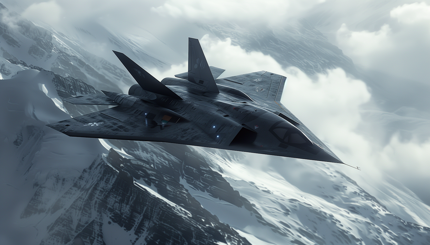 Futuristic stealth aircraft flying over snow-covered mountains, showcasing advanced technology and sleek design.