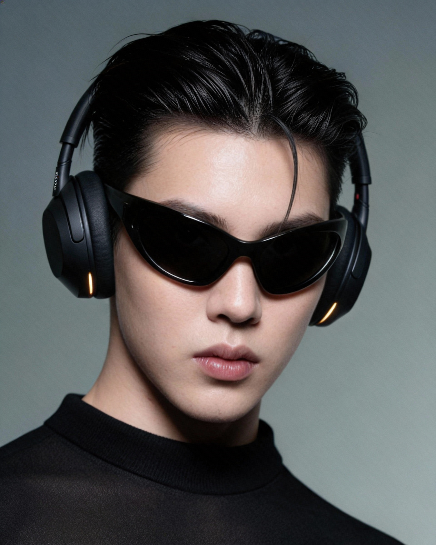 Stylish individual wearing sleek black sunglasses and modern headphones, exuding a contemporary and tech-savvy vibe.