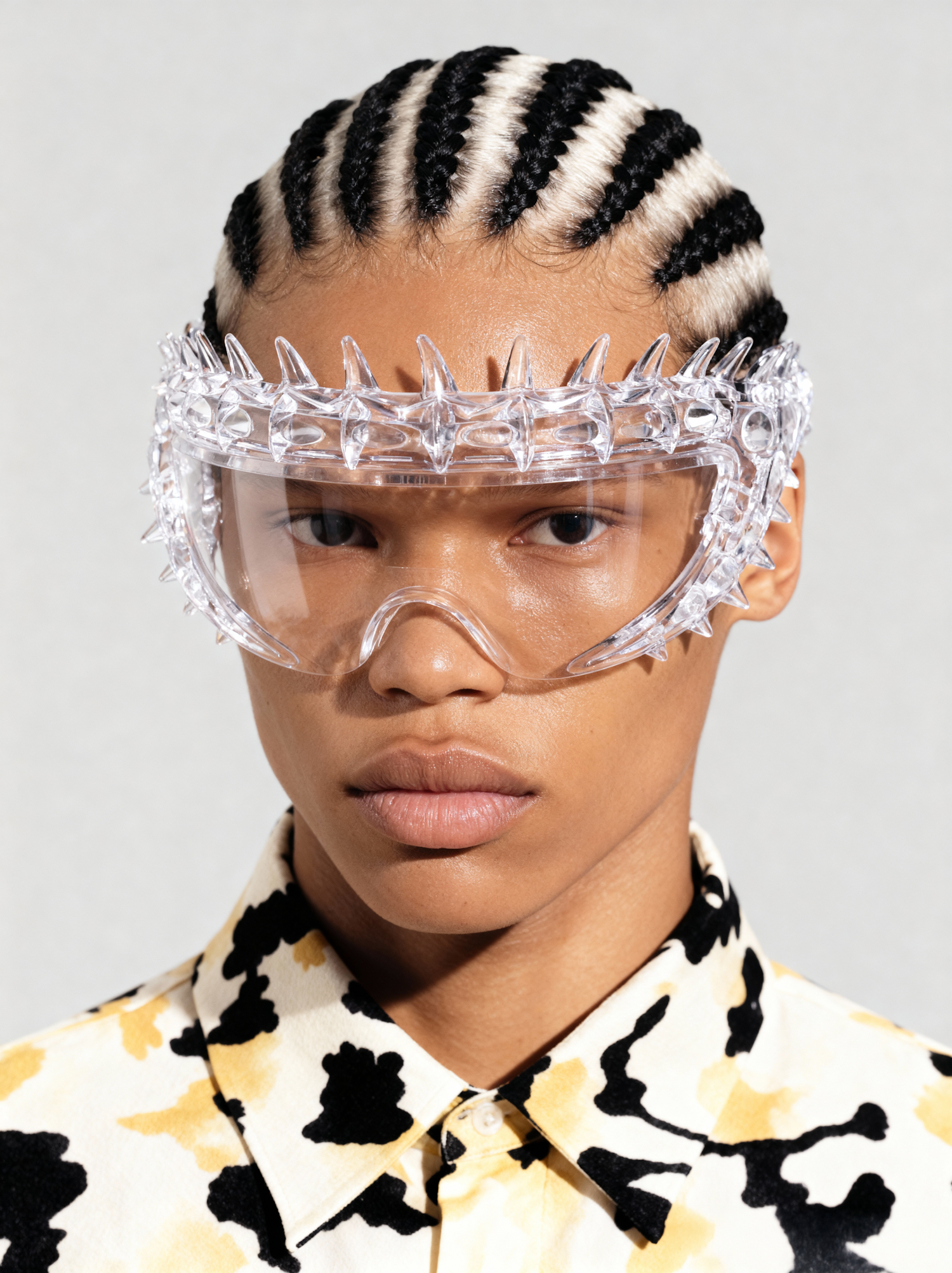 A stylish individual with cornrow braids and spiked clear goggles, wearing a patterned shirt with abstract black and yellow designs.