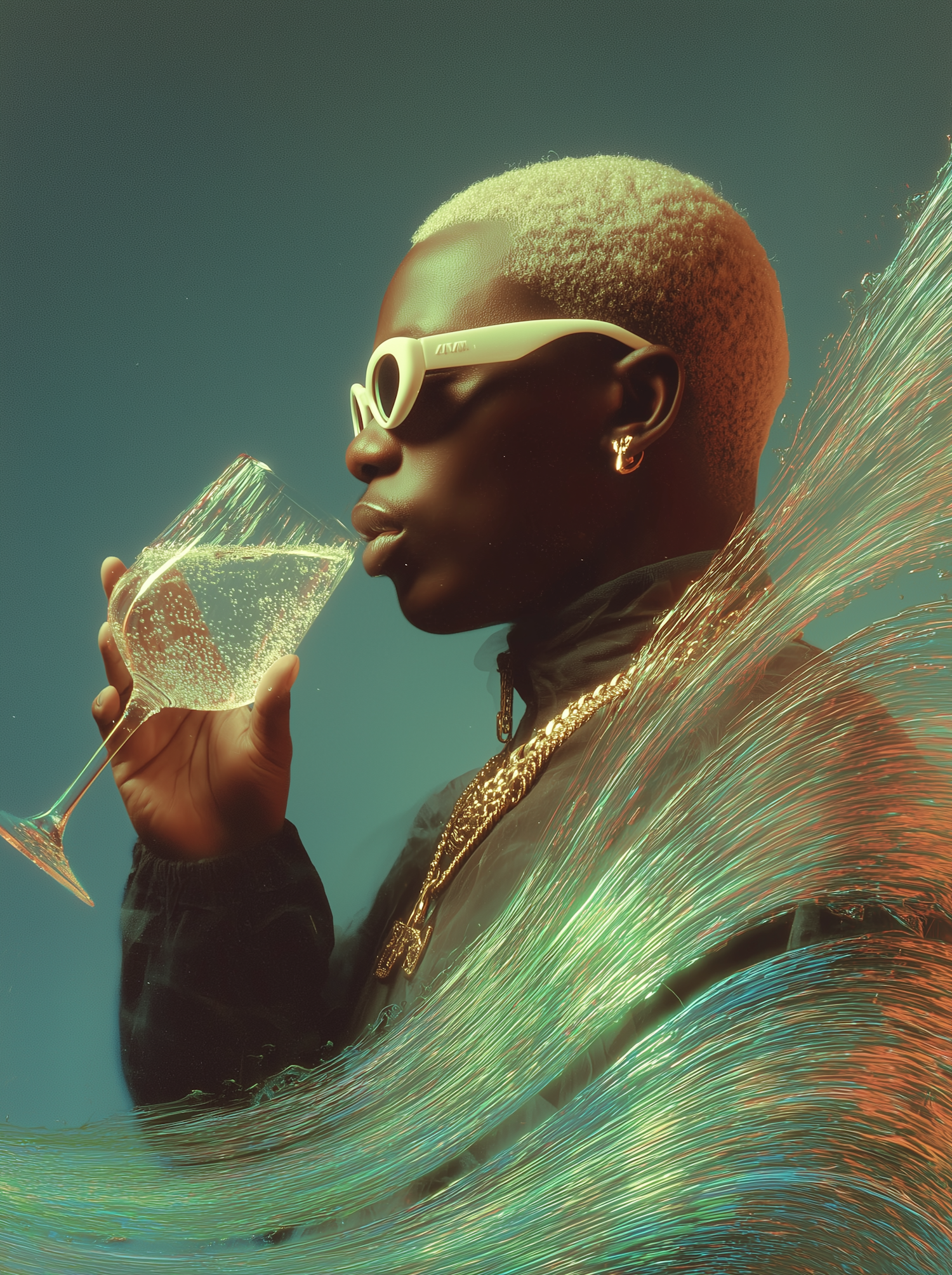 A fashionable person with blonde hair and white sunglasses drinks from a glass, surrounded by colorful light streaks on a teal background.