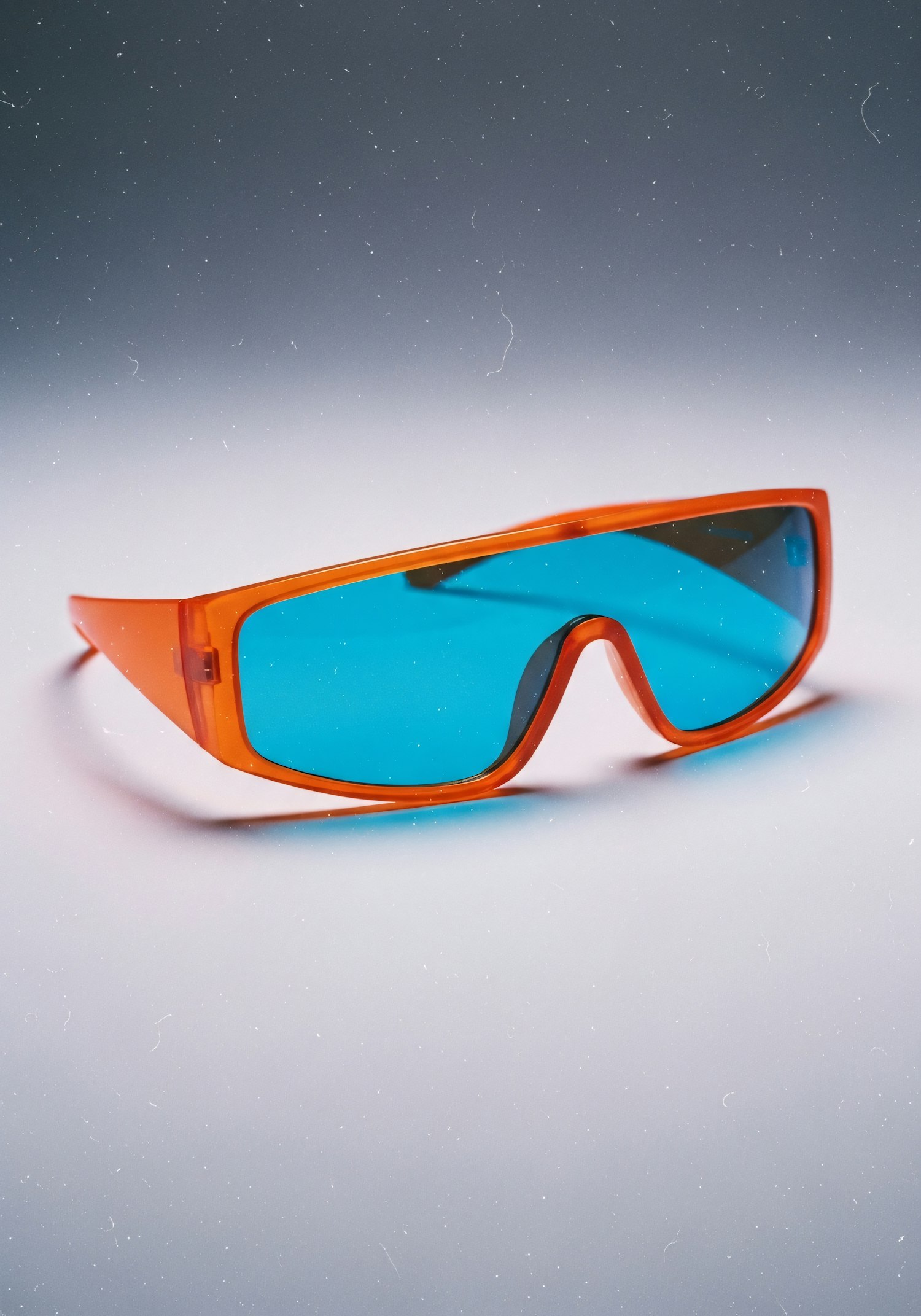 Bold orange sunglasses with blue lenses on a gradient background, showcasing a modern and sporty design.