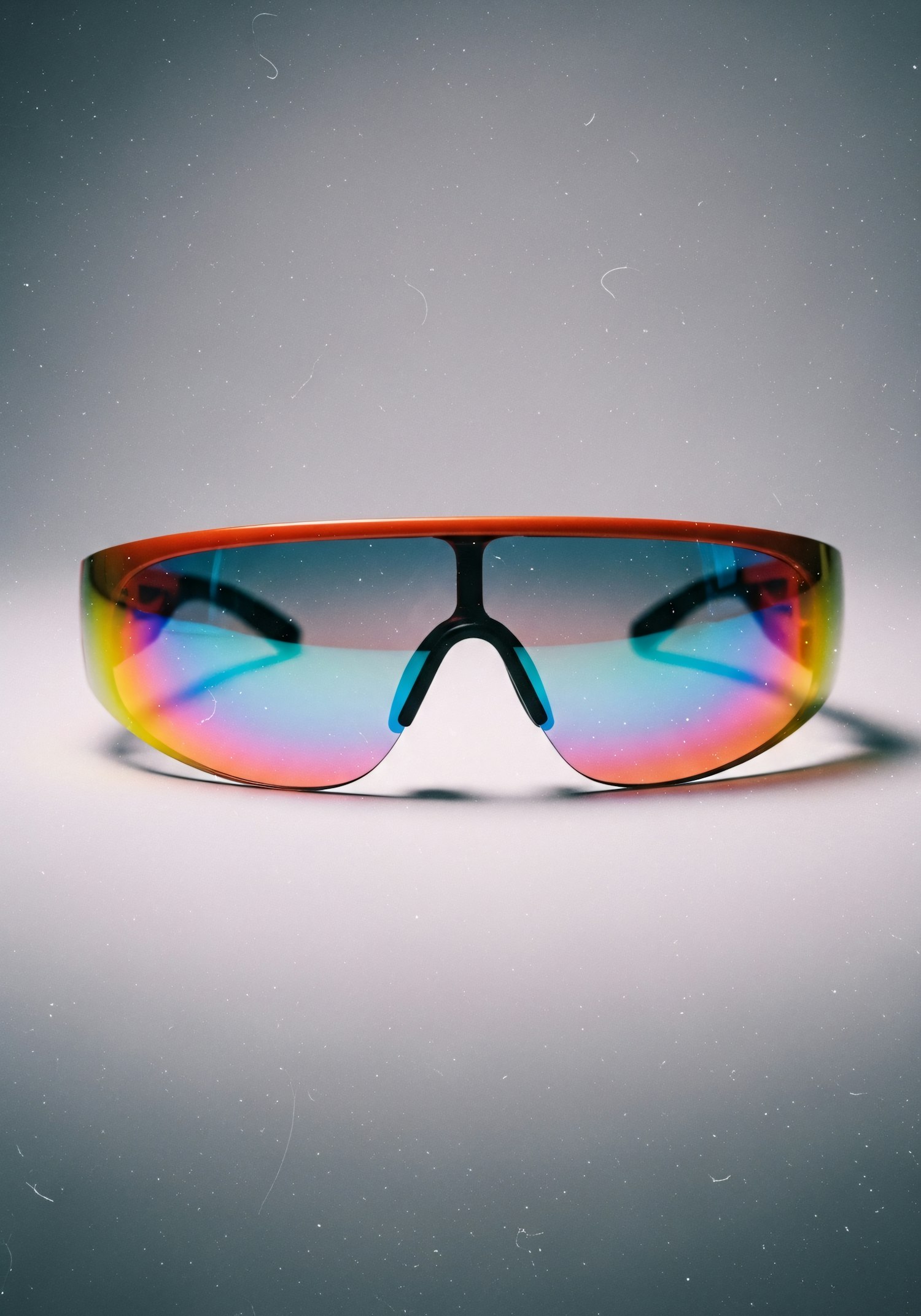 Futuristic sunglasses with vibrant gradient lenses and a sleek red and black frame, set against a neutral gray background.