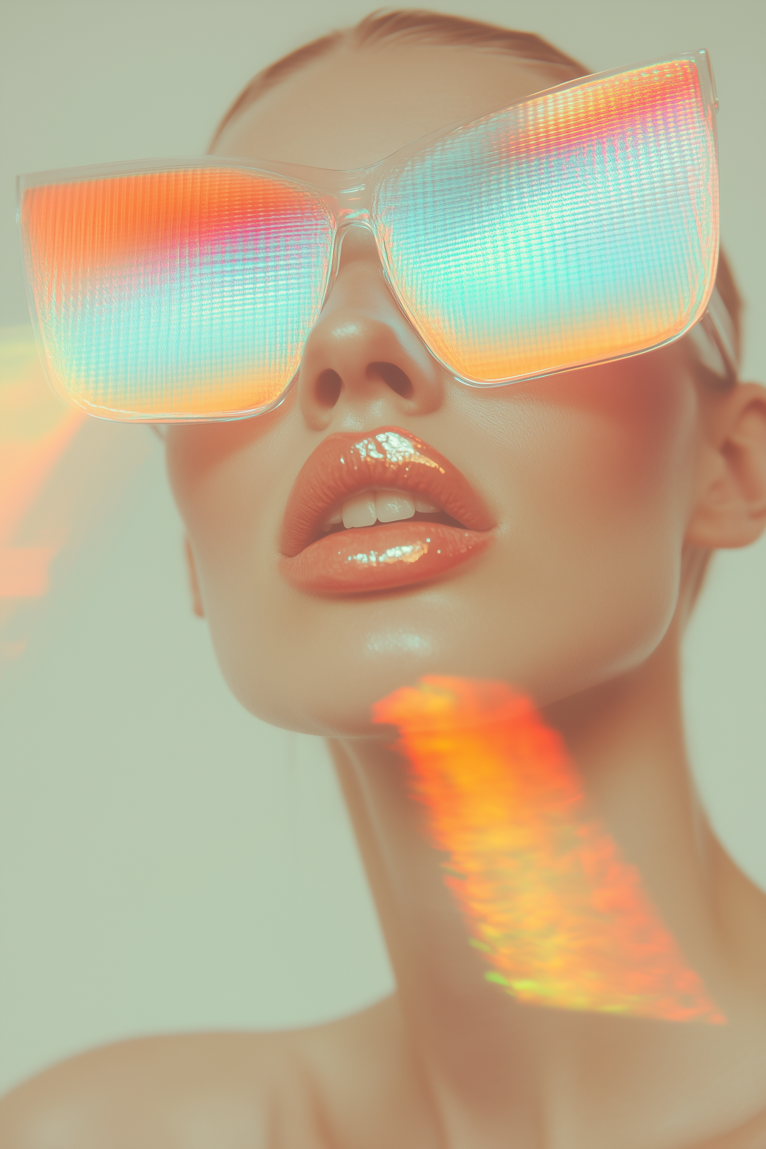 Close-up of a woman wearing oversized holographic sunglasses with vibrant reflections and glossy coral lips, set against a neutral background.