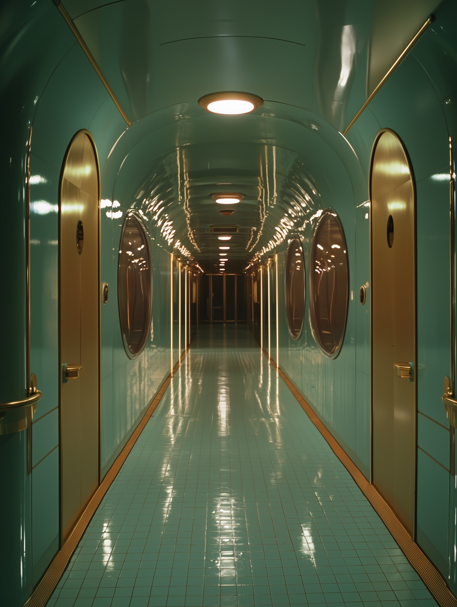 A retro-futuristic teal hallway with glossy walls, oval windows, and warm lighting, evoking a luxury train or submarine interior.