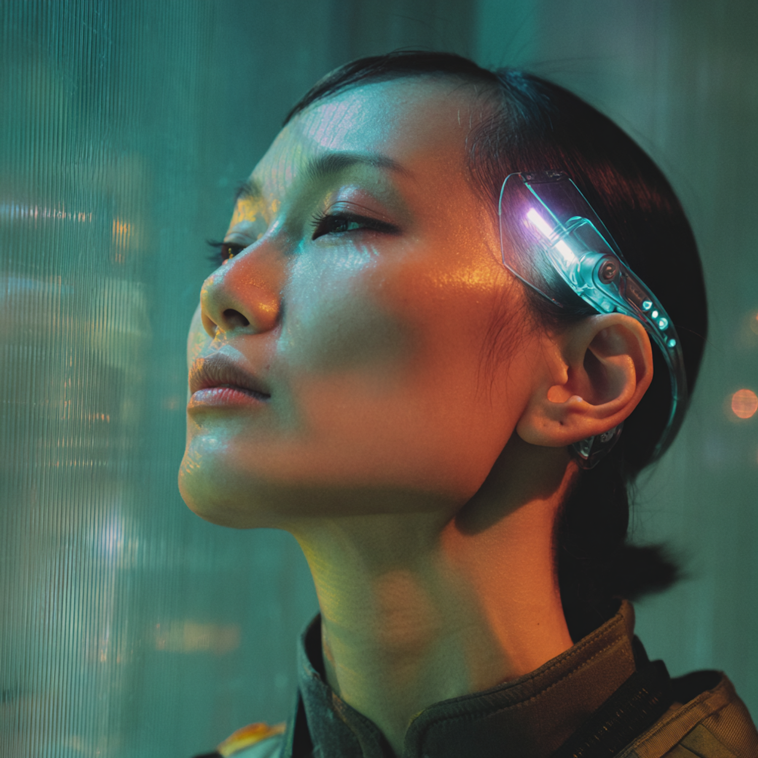 A woman wearing a glowing futuristic headpiece, illuminated by green and orange light, in a sleek, high-tech setting.