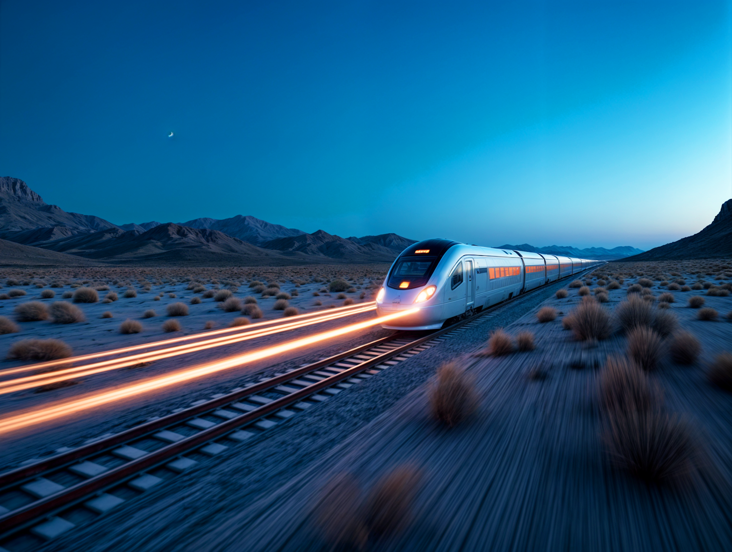 High-speed train racing through a desert at twilight, with glowing headlights and a crescent moon in the sky.