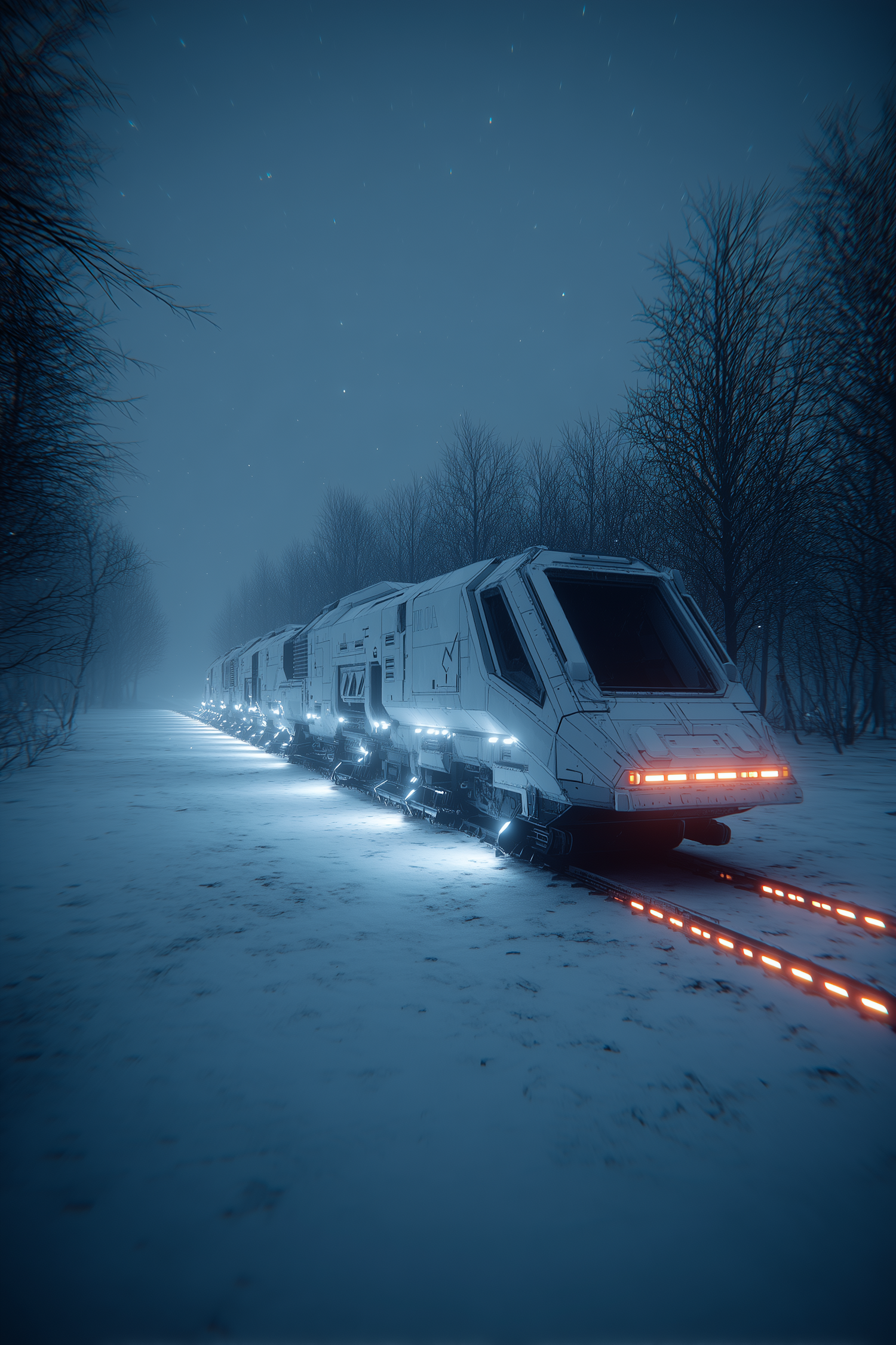 A futuristic train illuminated by glowing lights travels through a snowy forest under a serene, starry night sky.