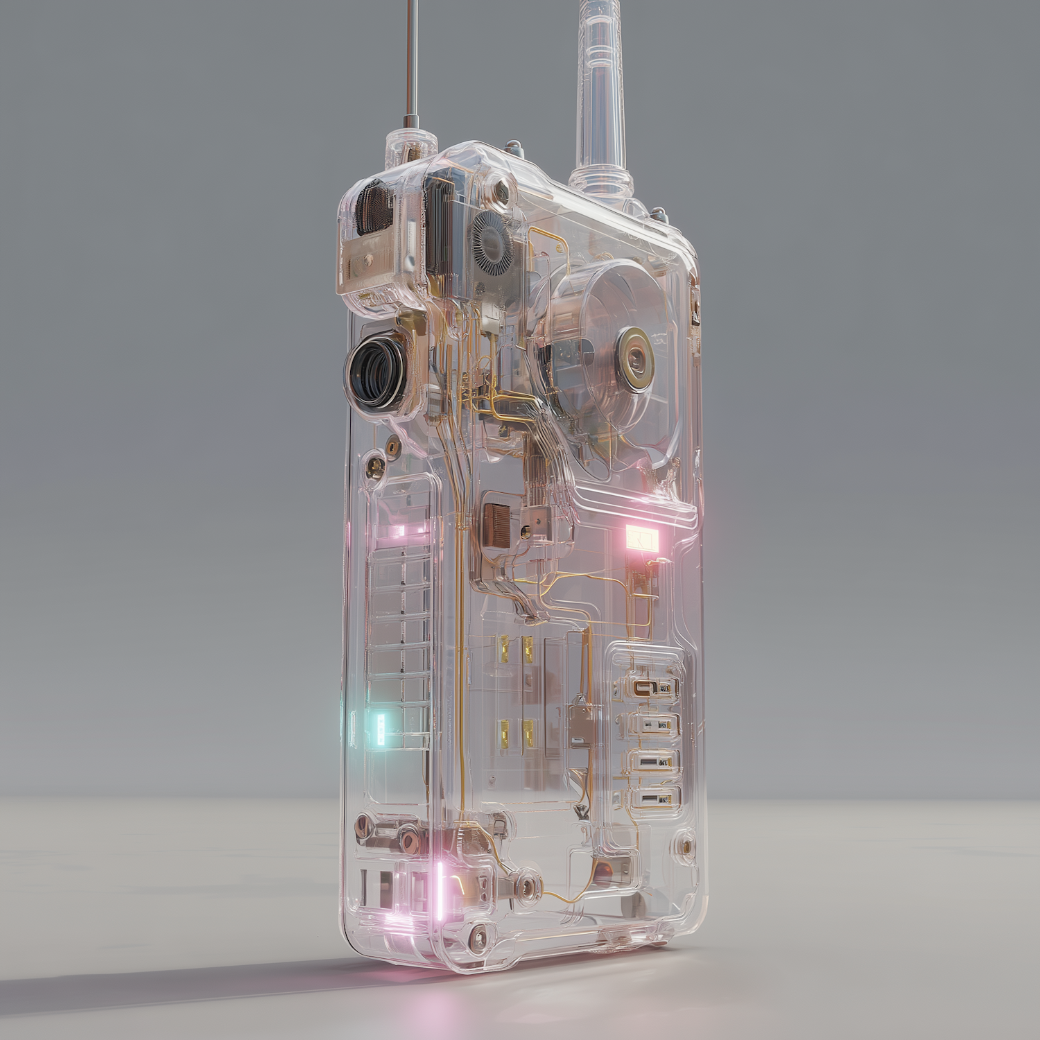 Transparent electronic device with visible circuits and glowing lights, blending retro and futuristic design elements.