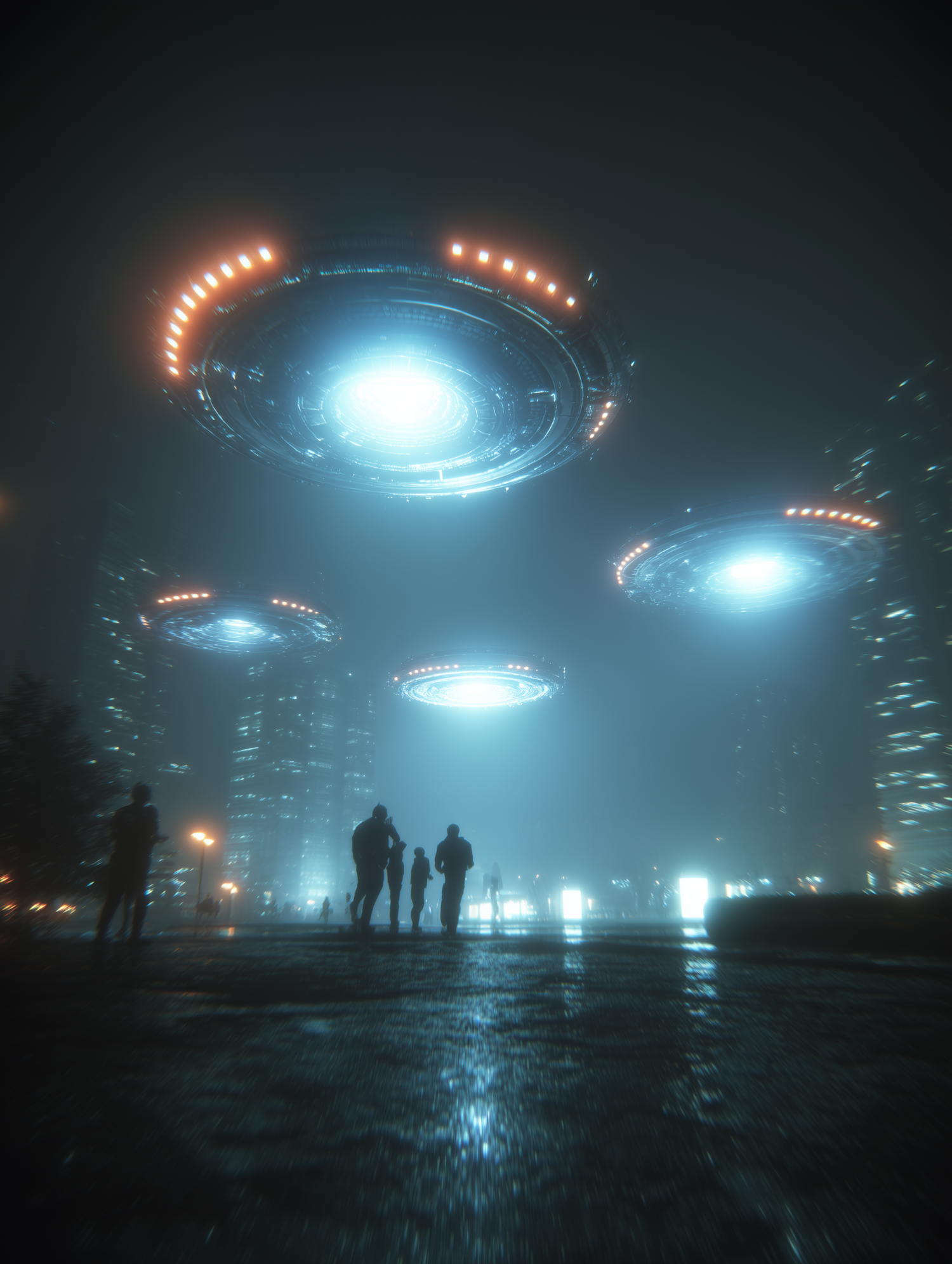 A futuristic cityscape at night with glowing UFOs hovering above and silhouettes of people gazing in awe, creating a mysterious atmosphere.