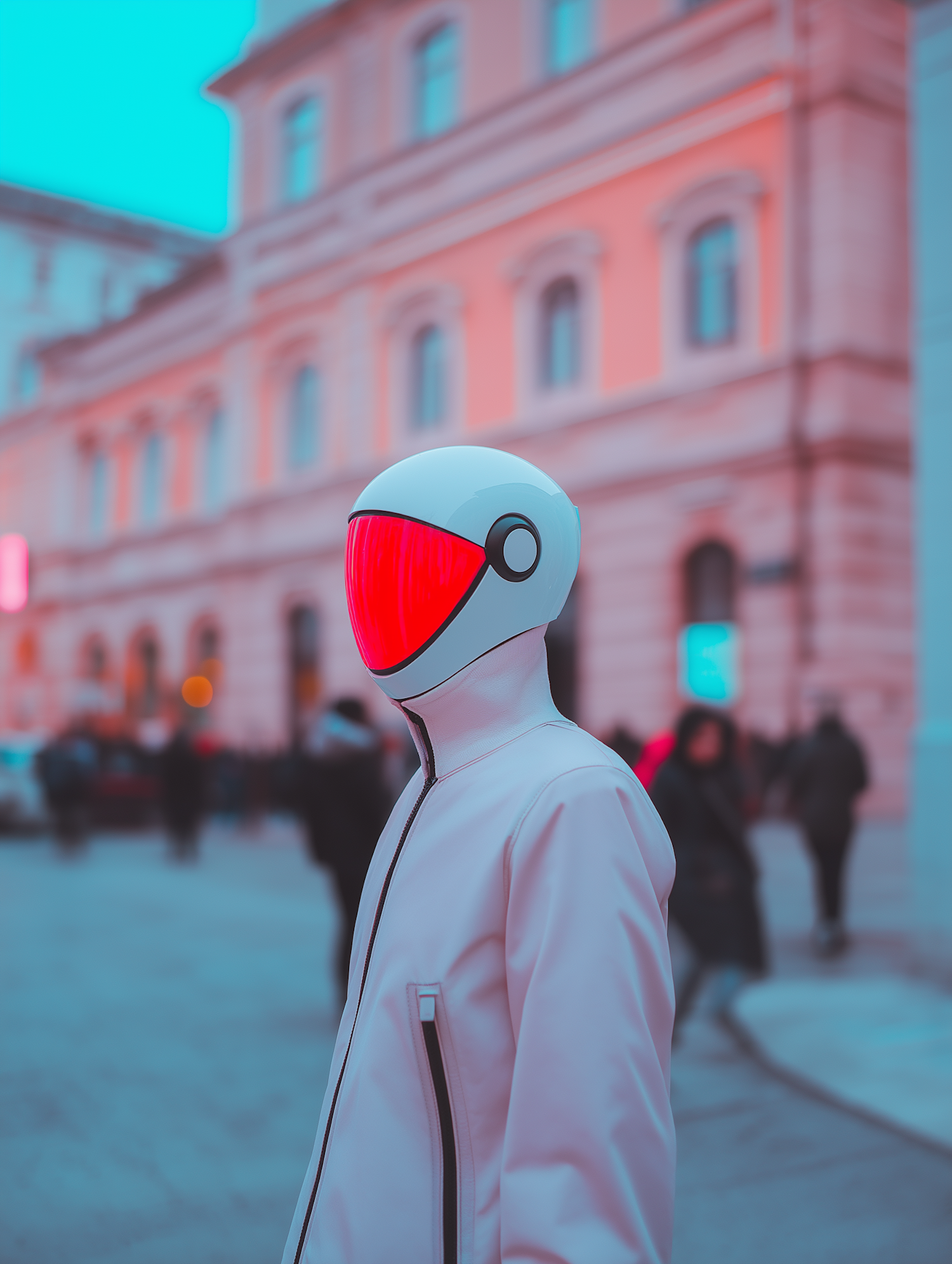 Futuristic figure in a white helmet with red visor in a pastel urban setting, blending modern design with classical architecture.
