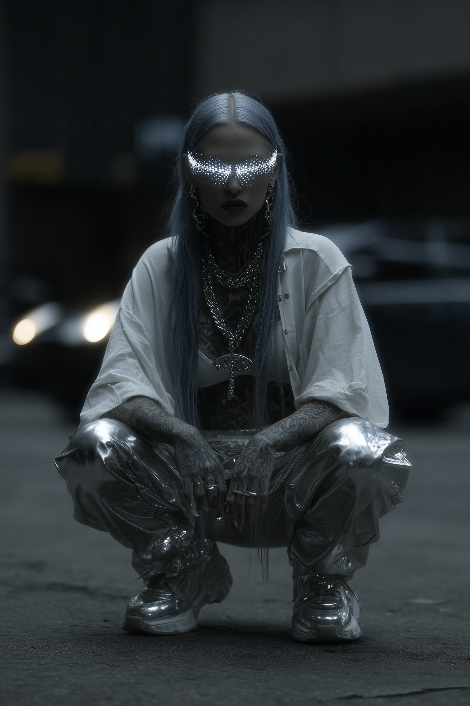 A person with blue hair and LED glasses crouches stylishly in reflective pants and bold accessories in a dark urban setting.