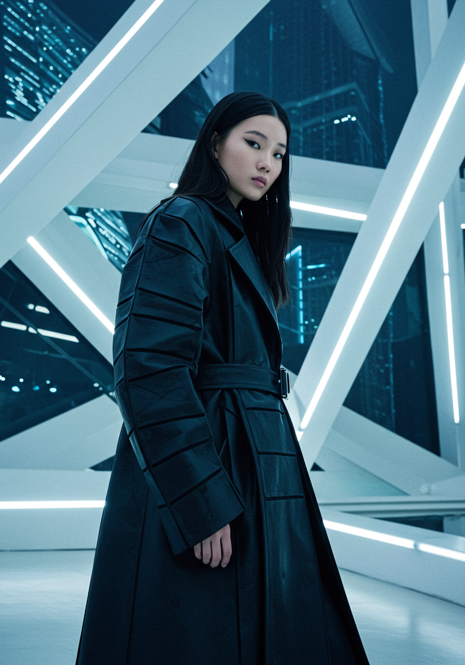 Stylish woman in a black leather trench coat in a futuristic setting with glowing white beams and urban architecture.