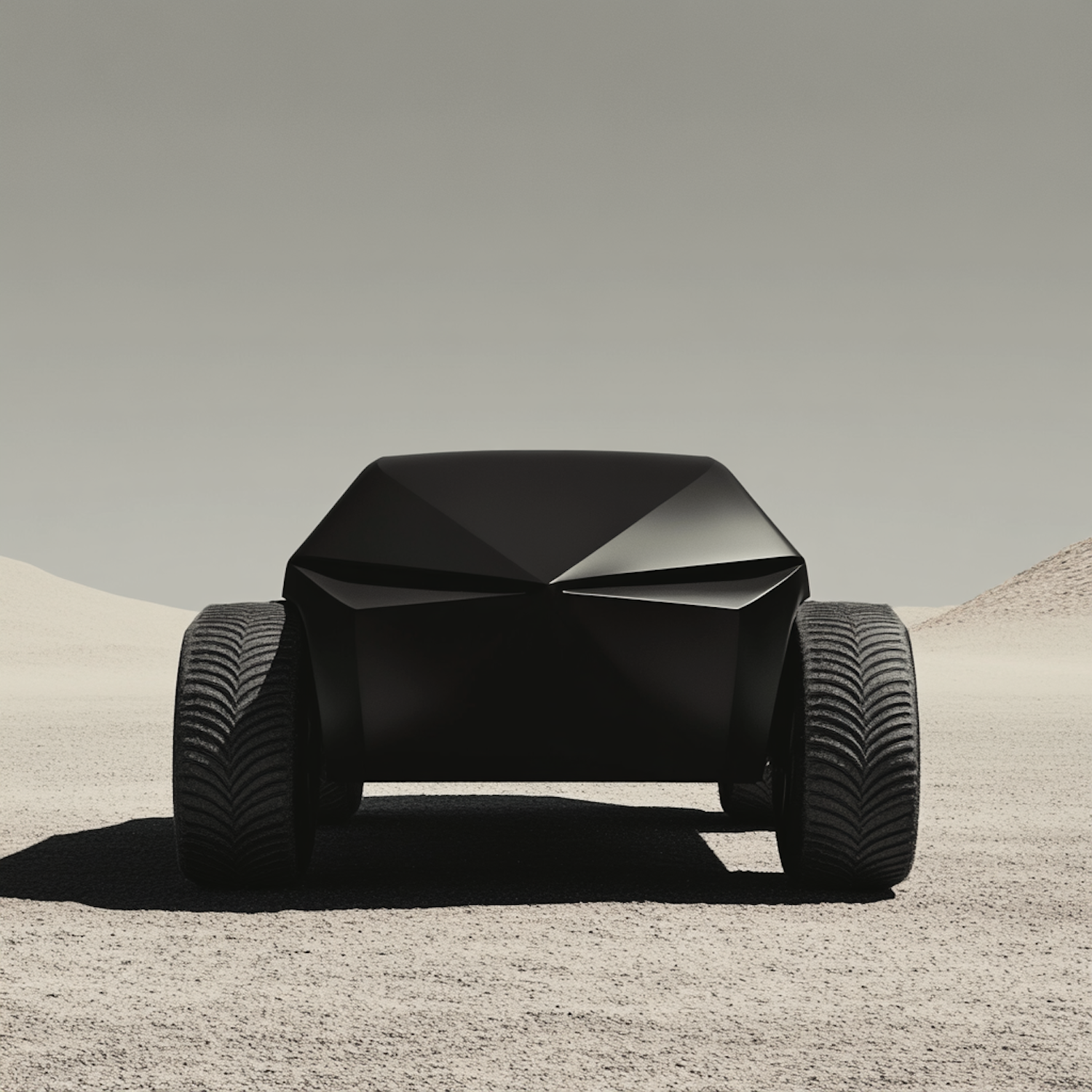 Futuristic black vehicle with angular design in a desert landscape, featuring rugged tires and a sleek, geometric body.
