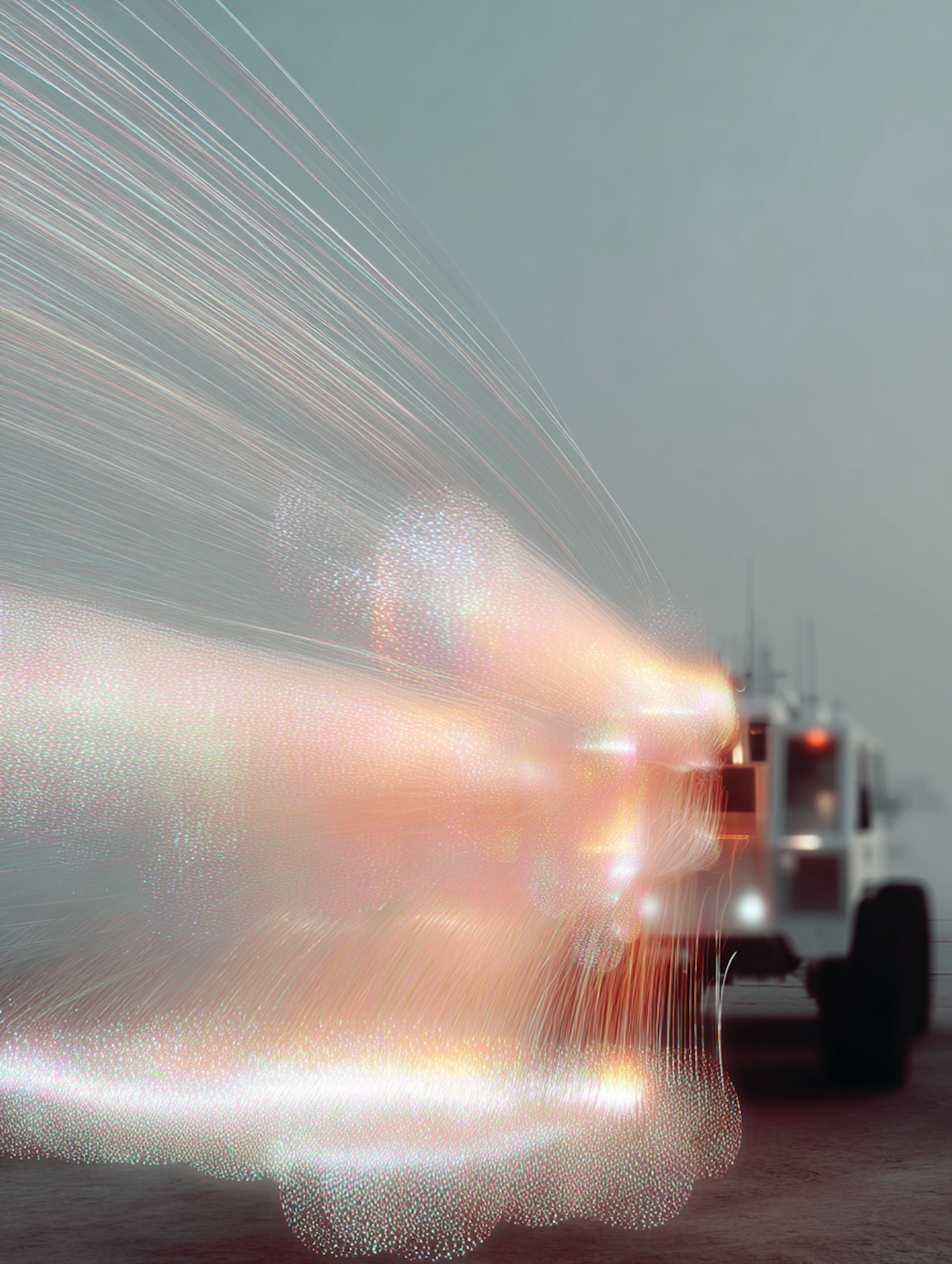 A futuristic vehicle emits vibrant, glowing light trails in a surreal, muted environment, showcasing advanced technology and design.