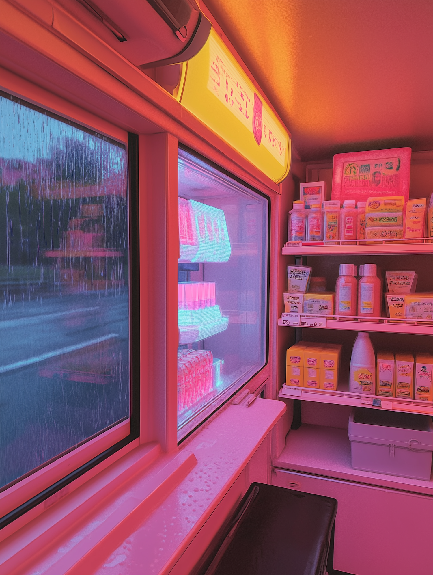 Neon-lit convenience store interior with raindrops on the window, vibrant pink and orange hues, and shelves stocked with products.