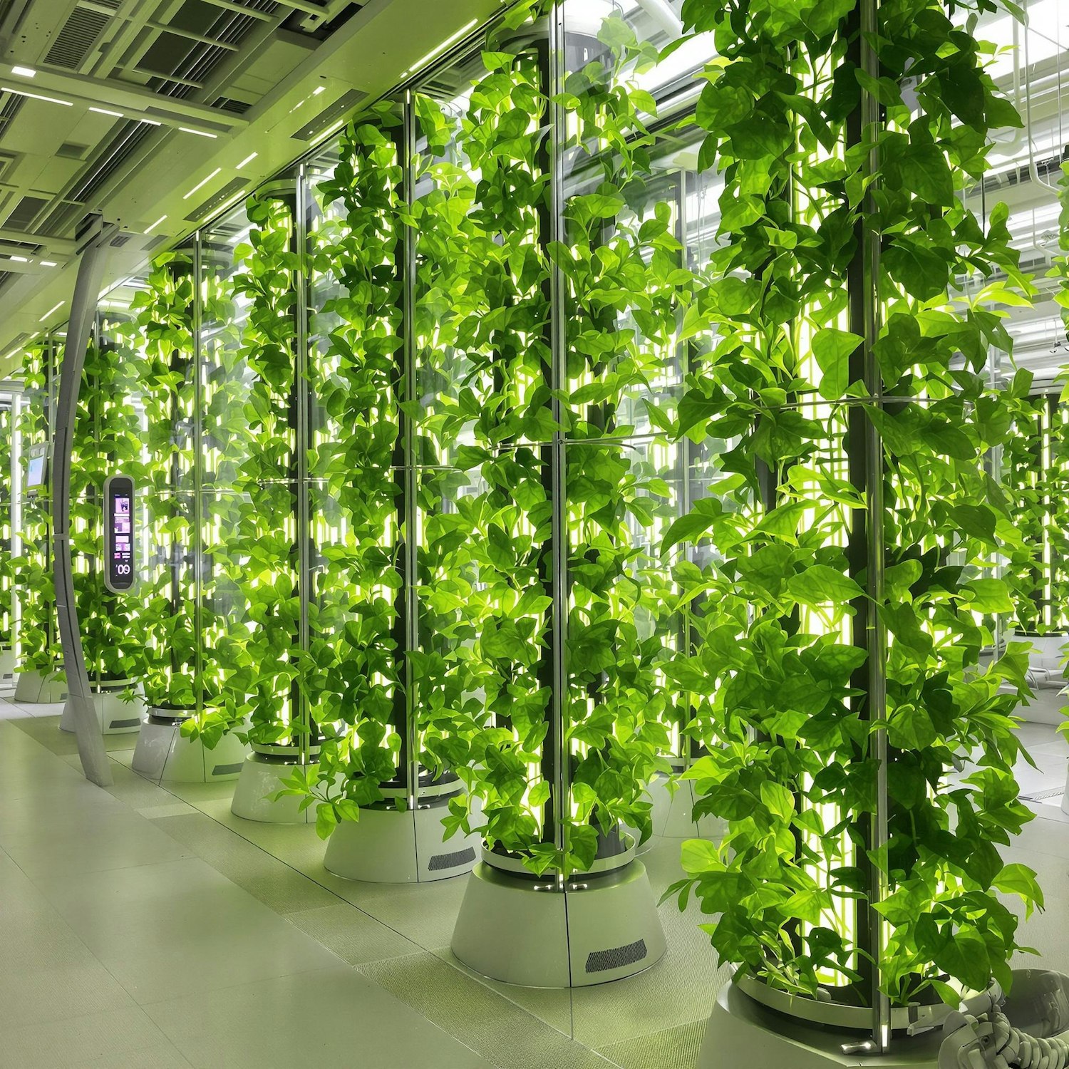 Futuristic vertical farming setup with lush green plants in glass cylinders, illuminated by LED lights in a sleek, modern environment.